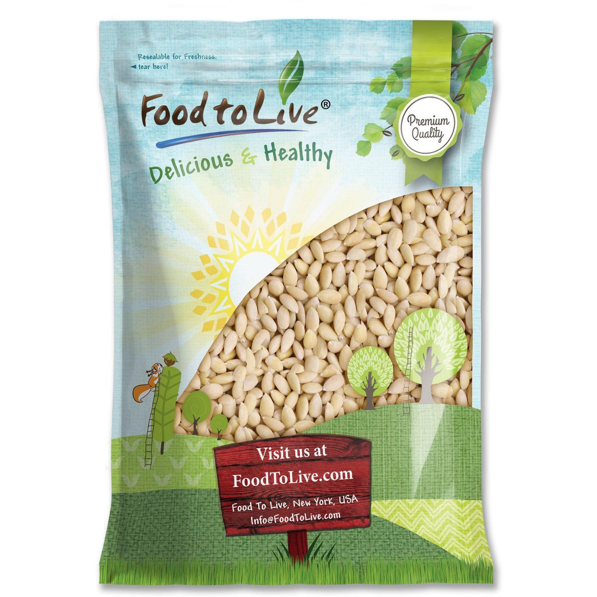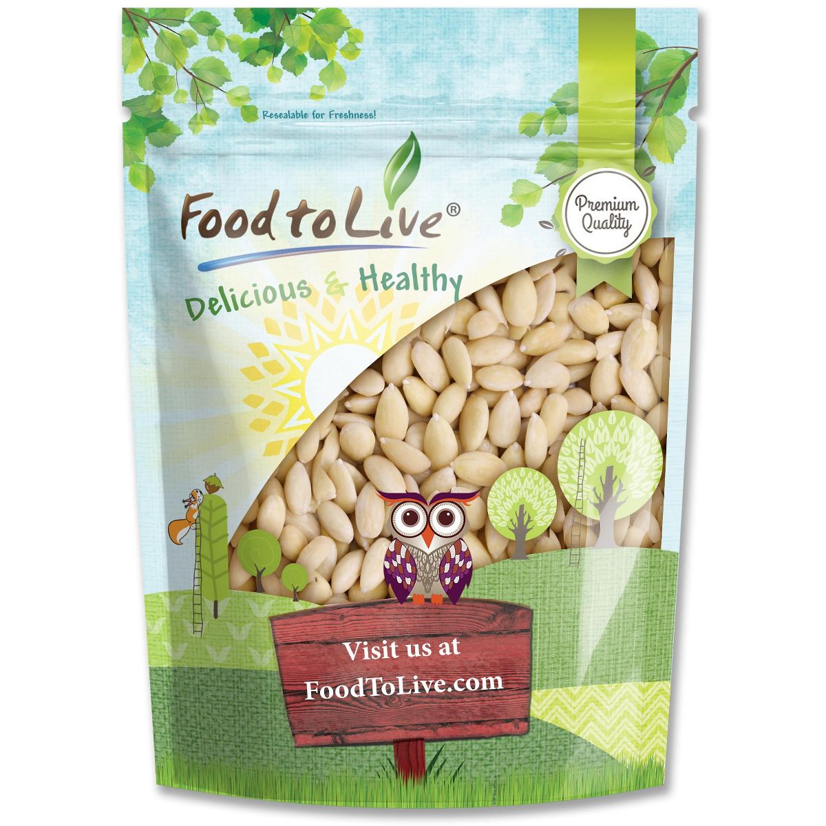Almendras blanqueadas Food to Live. Enteras, sin piel, listas para usar en tus recetas dulces o saladas. Calidad premium directa a tu puerta.