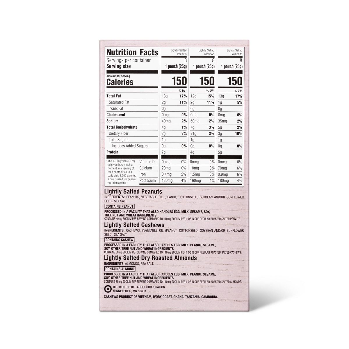 Disfruta el sabor y la frescura de Good & Gather. Nuestro paquete con almendras, cacahuates y nueces de la India es el snack perfecto y saludable.