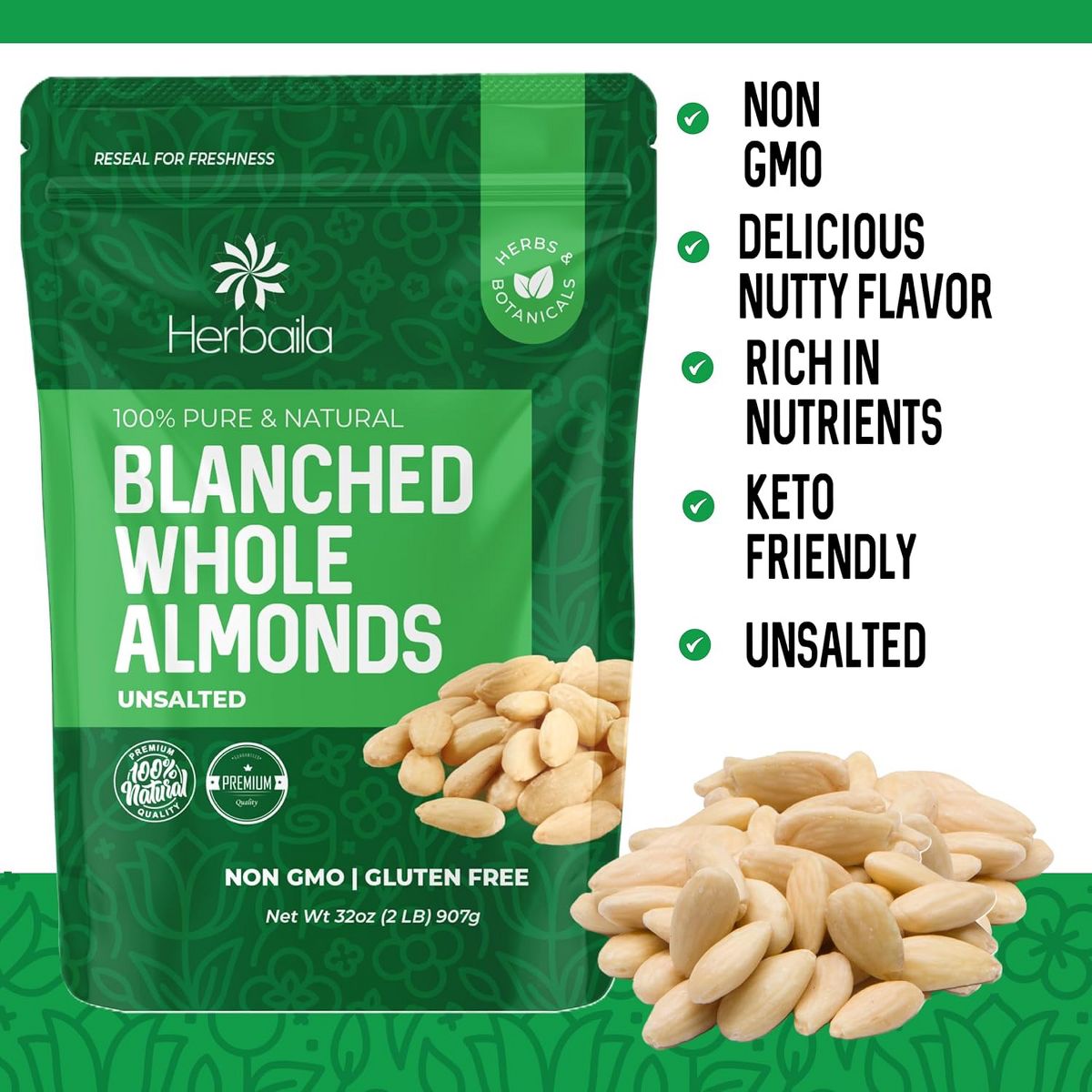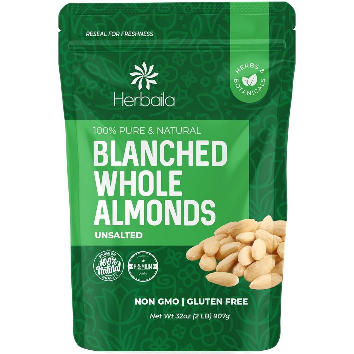 Almendras crudas Herbaila, 2 lb. Enteras y naturales, perfectas para snacks saludables o recetas. ¡Sabor y nutrición en cada bocado!