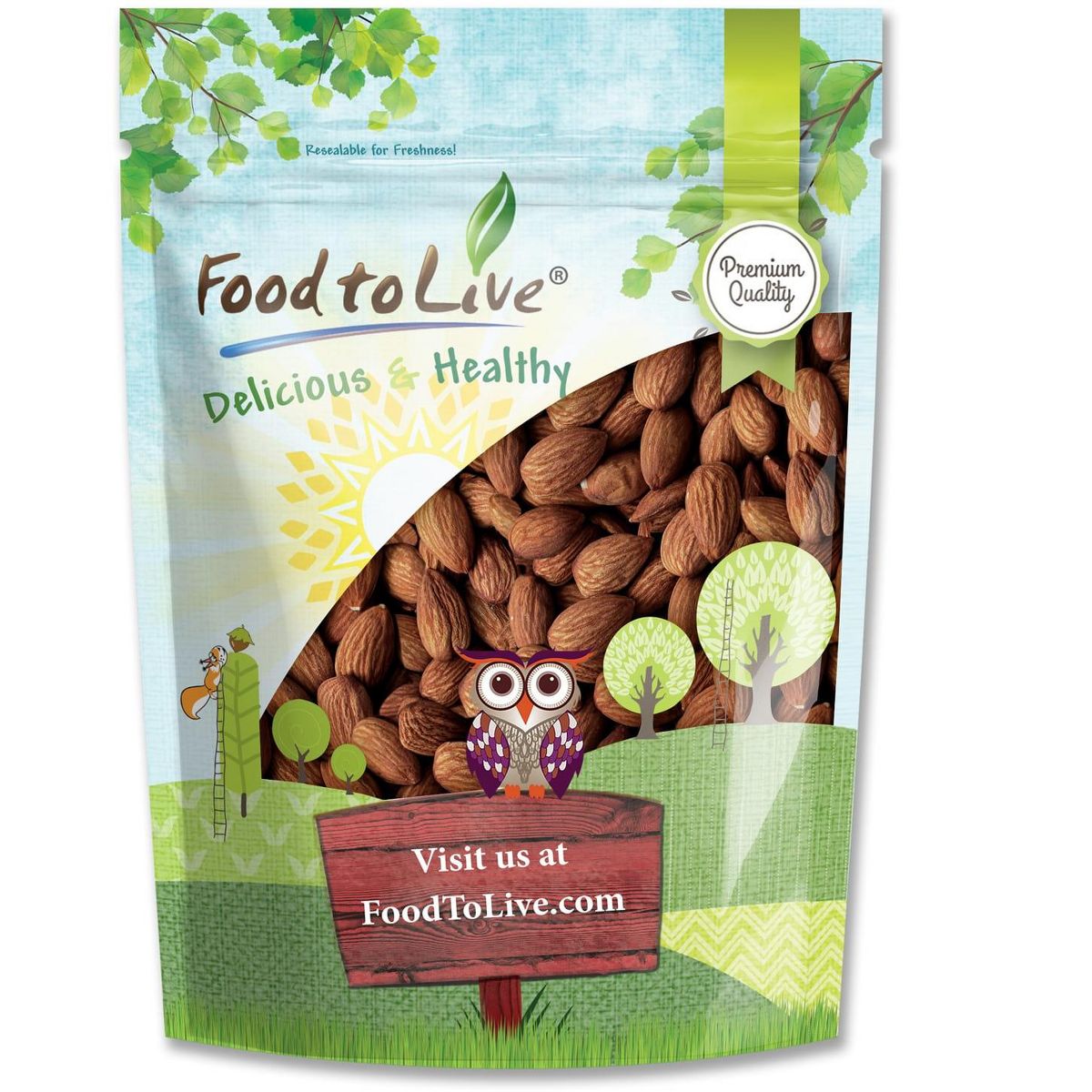 Almendras tostadas en seco con sal del Himalaya de Food to Live. Enteras, crujientes y deliciosas. Compra tu snack natural y saludable ahora.