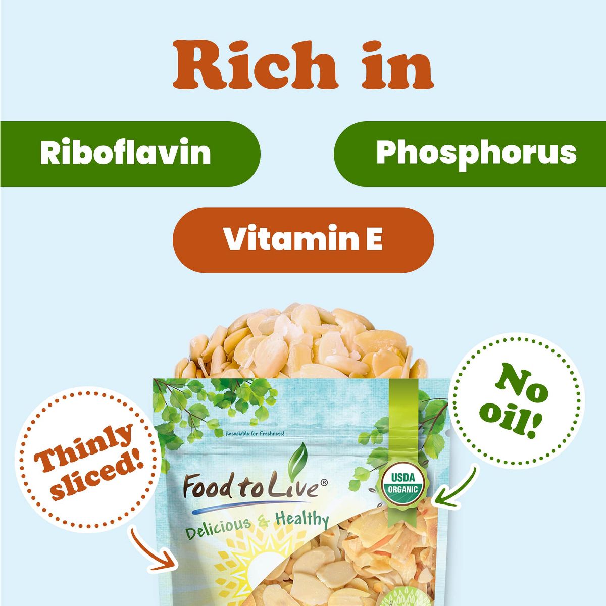 Almendras fileteadas tostadas y blanqueadas orgánicas de Food to Live. Perfectas para recetas, postres o como snack saludable. ¡Pruébalas!