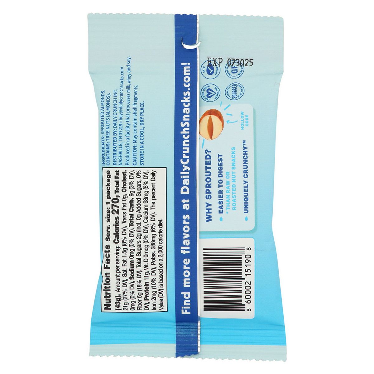 Almendras germinadas Daily Crunch, crujientes y nutritivas. Perfectas para un snack saludable. Disfruta el sabor original en prácticos paquetes.