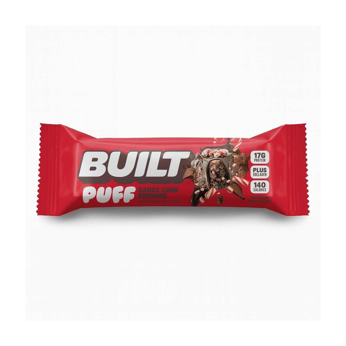 Disfruta la barra Built Bar Candy Cane Brownie con 17g de proteína y textura masticable. Sabor navideño y nutrición en cada bocado.