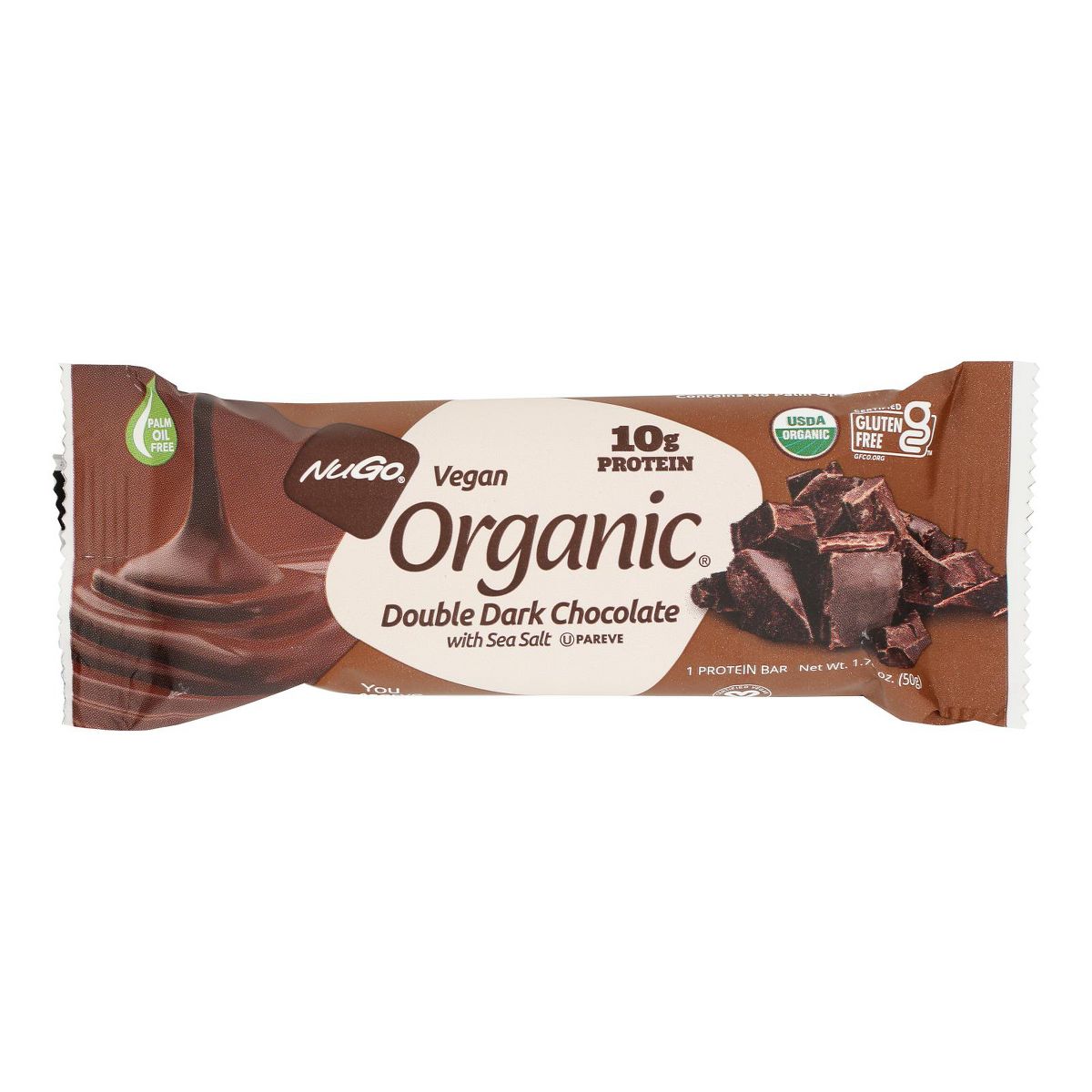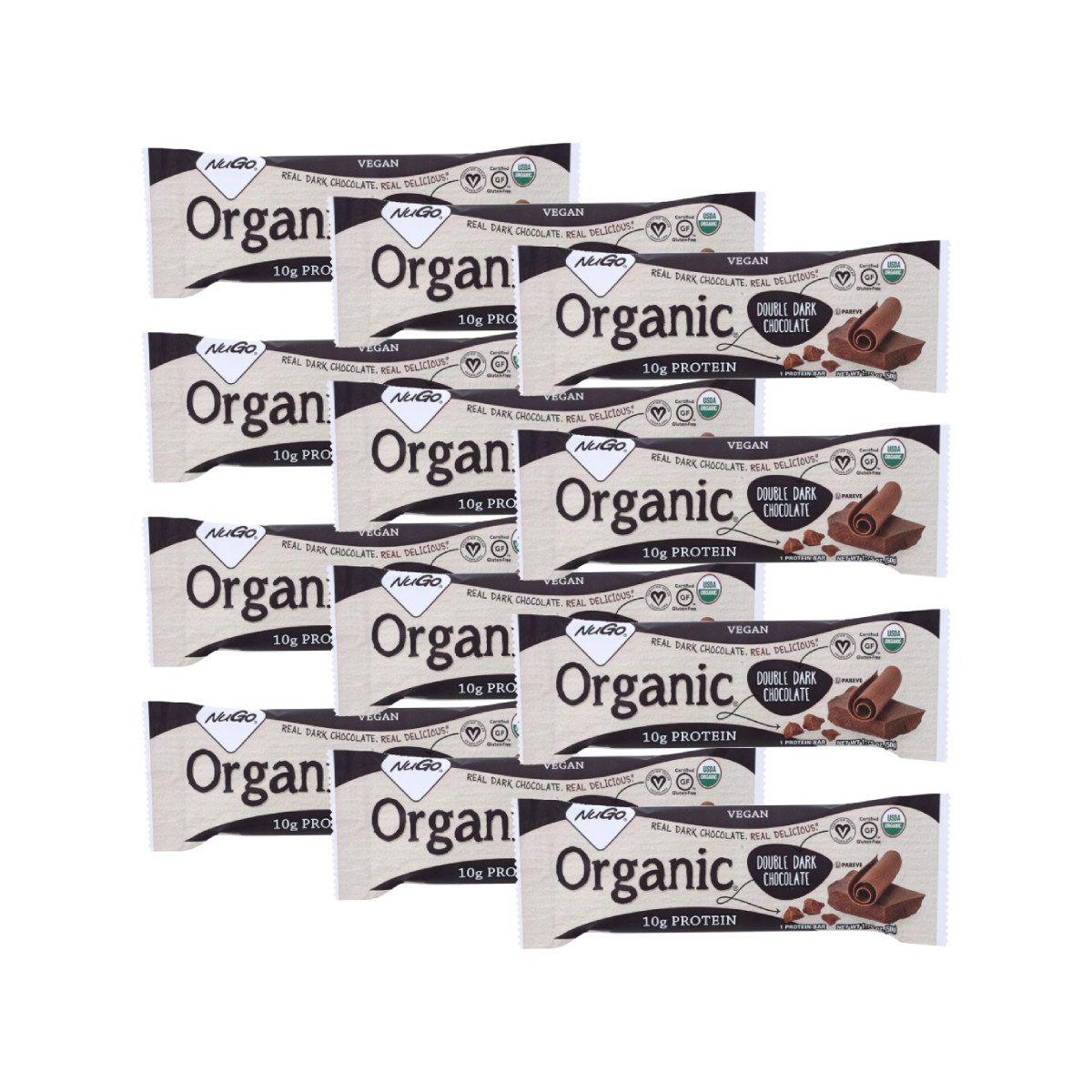 Disfruta la barra vegana NuGo Organic Double Dark Chocolate. Textura masticable y delicioso sabor intenso. Pack de 12 barras. ¡Tu snack saludable ideal!