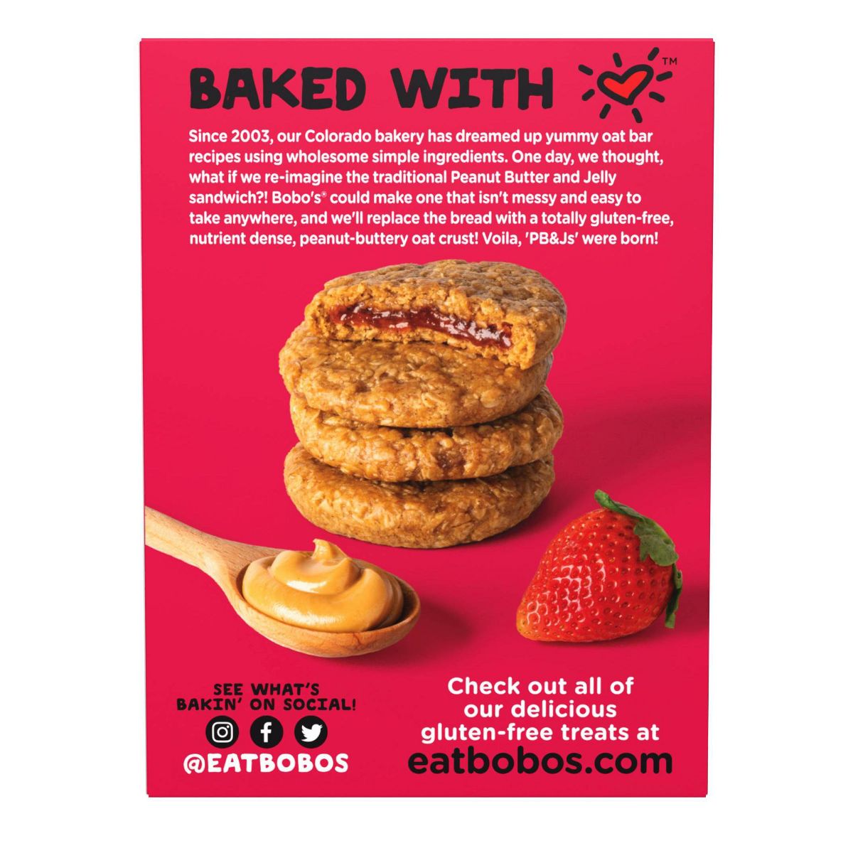 Barras de avena Bobo’s PB&Js de fresa. Deliciosa textura masticable con el sabor clásico de mantequilla de maní y jalea. ¡Un snack perfecto para llevar!