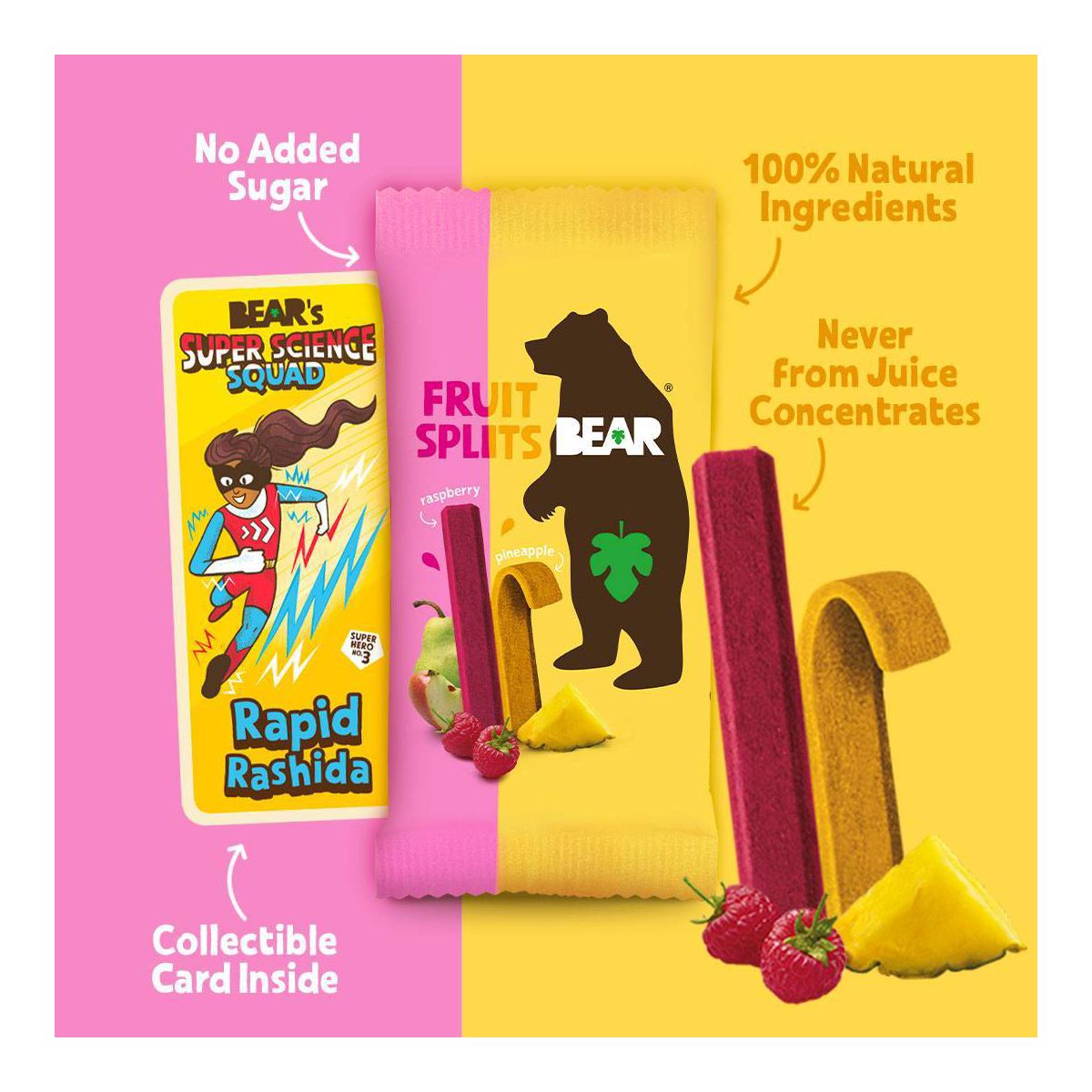 Disfruta el sabor tropical de frambuesa y piña con BEAR Fruit Splits. Snack saludable en práctico formato de barra. ¡Deliciosa energía natural!