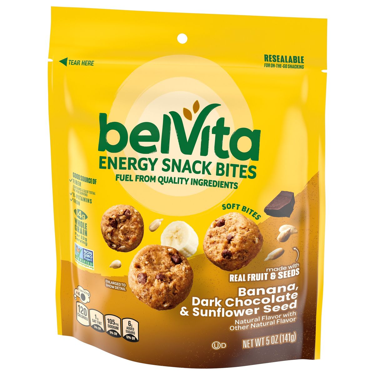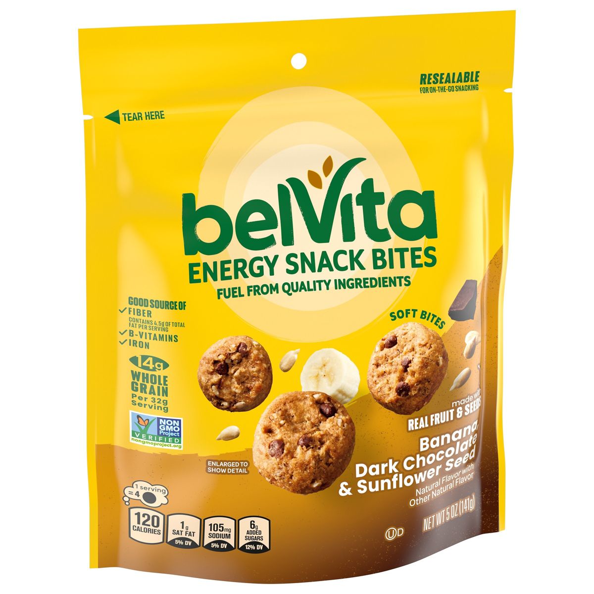 BelVita: Bocado energético crujiente de plátano y chocolate oscuro. Con semillas de girasol y proteína de soya. ¡Energía que disfrutas!