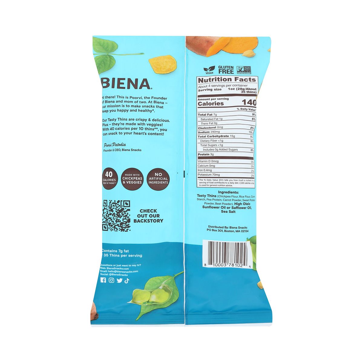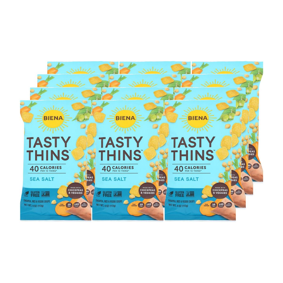 Biena Sea Salt Tasty Thins: crujientes snacks de garbanzo, sin gluten y verificados Non-GMO. Disfruta su sabor natural en una caja con 12 paquetes.