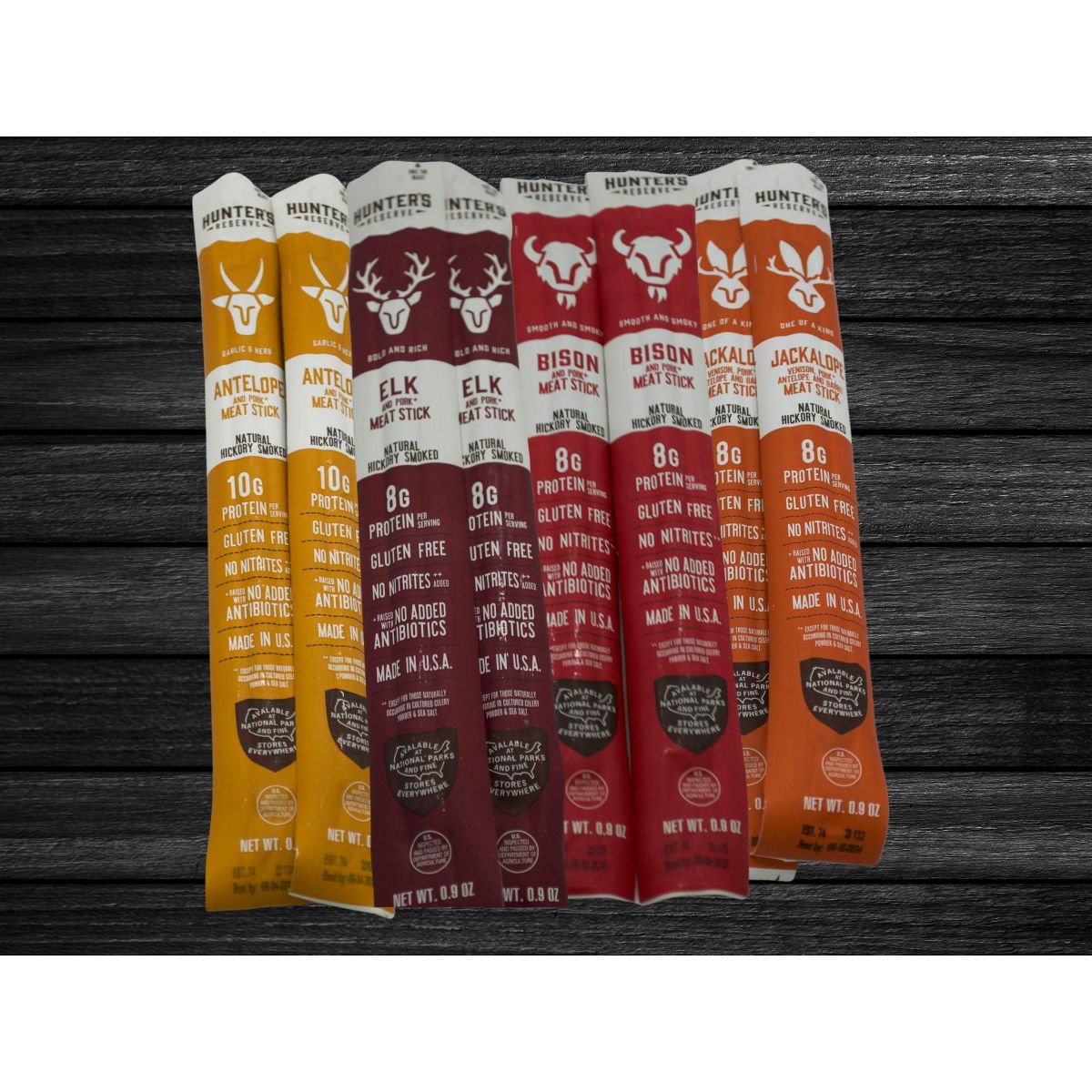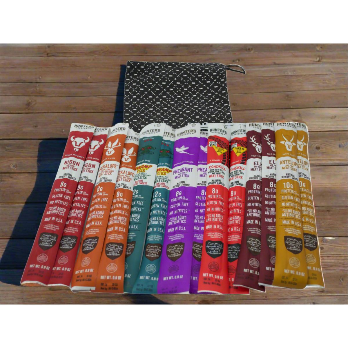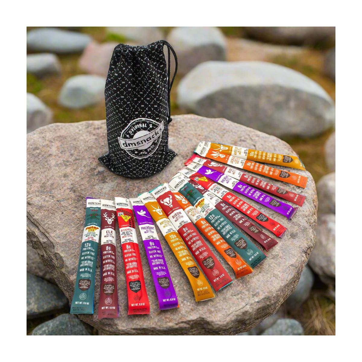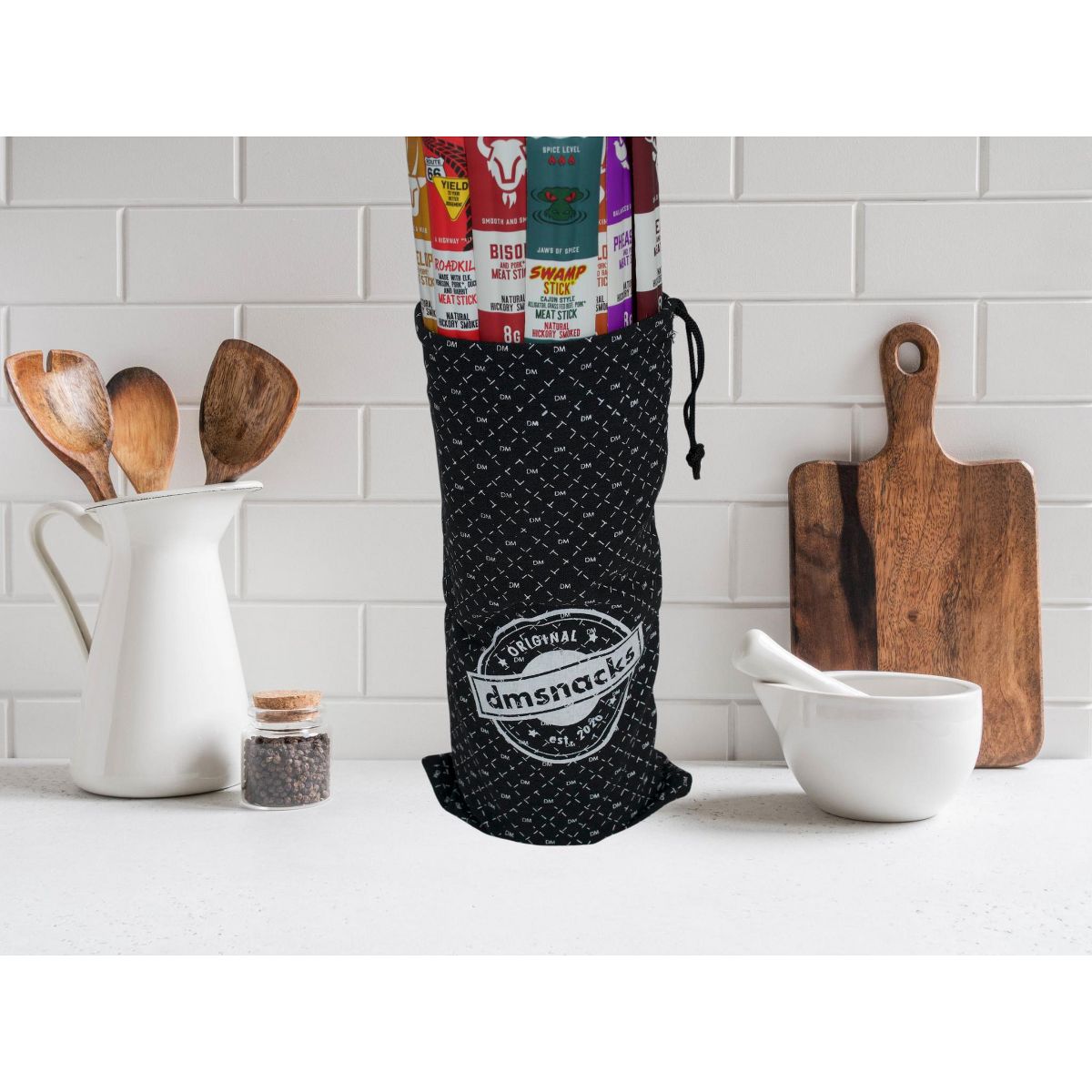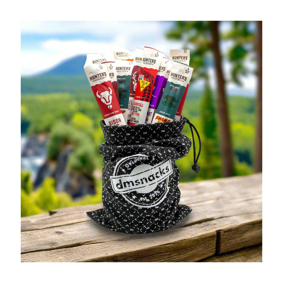 Bolsa de Palitos de Carne Exótica DMSnacks, 14 Palitos de Cecina de Caza Salvaje en Bolsa de Lona Reutilizable, Palitos de Carne Gourmet, Set de Regalo de Botana Mini y Orgánica