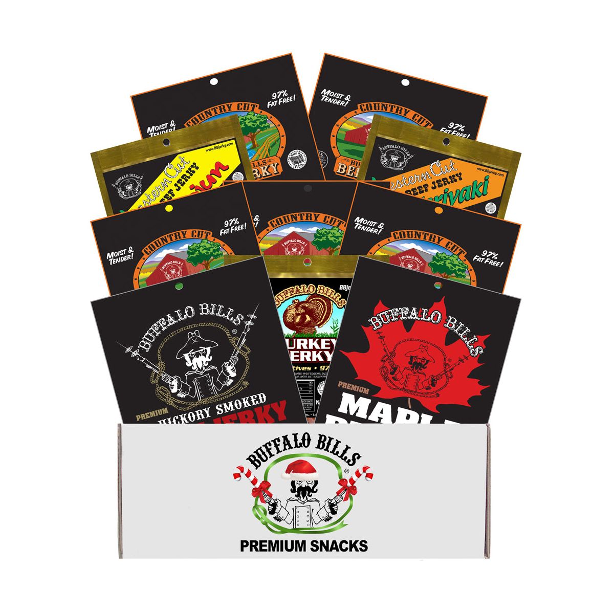 Caja de Regalo Navideña Buffalo Bills de 10 Piezas con Muestras Variadas de Carne Seca (10 paquetes de carne seca surtida)
