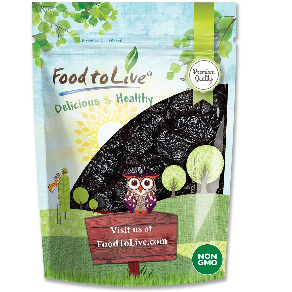 Ciruelas pasas sin hueso de Food to Live. Dulces, jugosas y listas para disfrutar. Contiene trigo. ¡Tu snack natural perfecto!