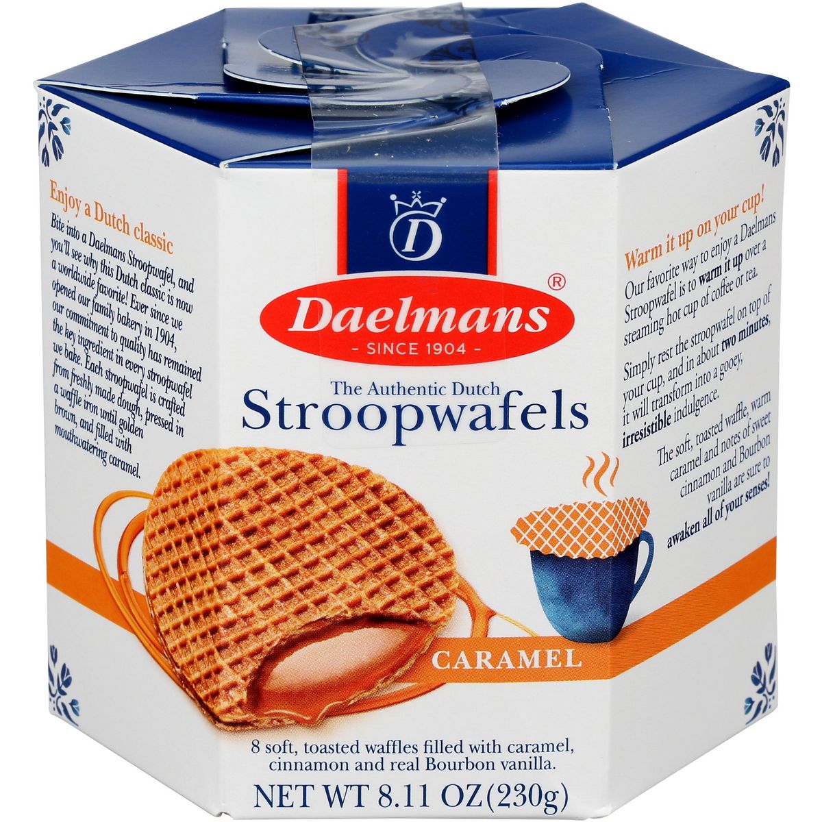 Disfruta las auténticas Daelmans Stroopwafels de caramelo. Suaves wafles listas para comer, perfectas para acompañar tu café. Paquete de 9.