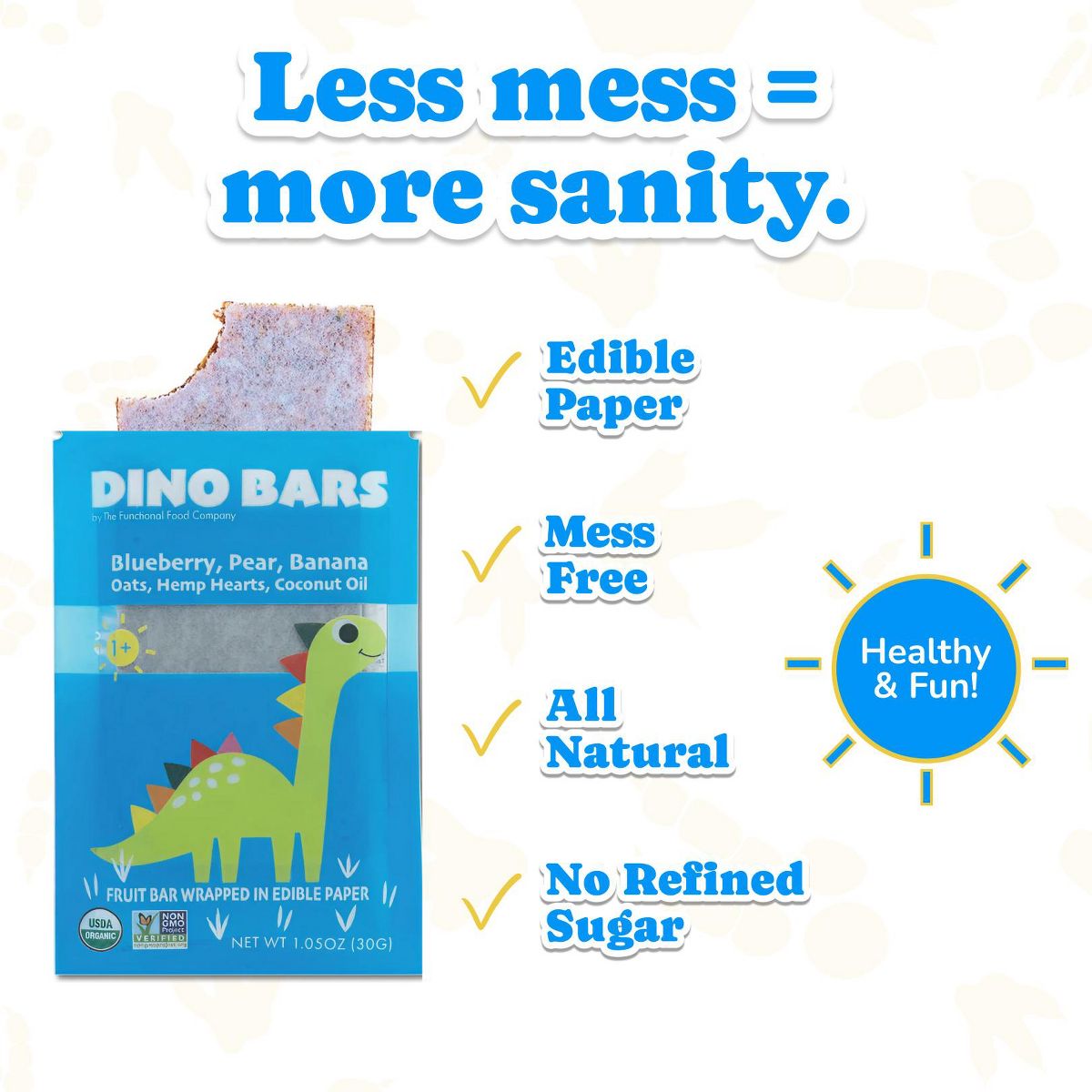 Barras DINO BARS de arándano, orgánicas y masticables. El snack de fruta sin desorden perfecto para los niños. ¡Deliciosas y nutritivas!