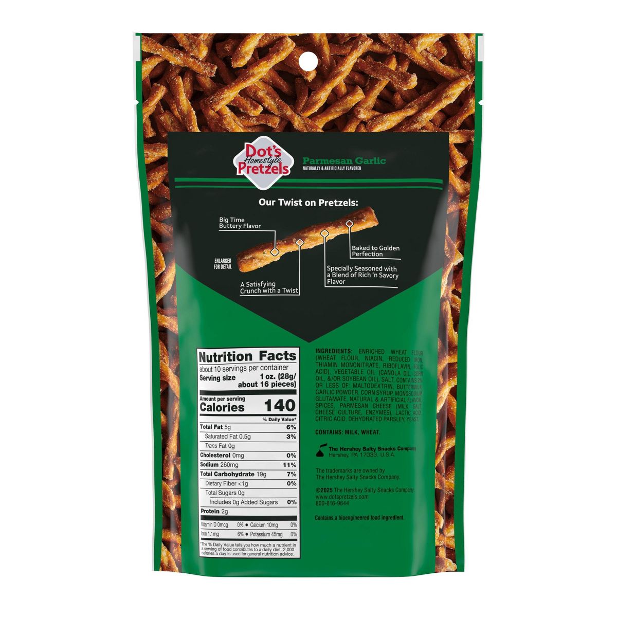 Dot’s Homestyle Pretzels. Disfruta el irresistible sabor a ajo y parmesano en cada crujiente pieza. El snack perfecto para cualquier momento.