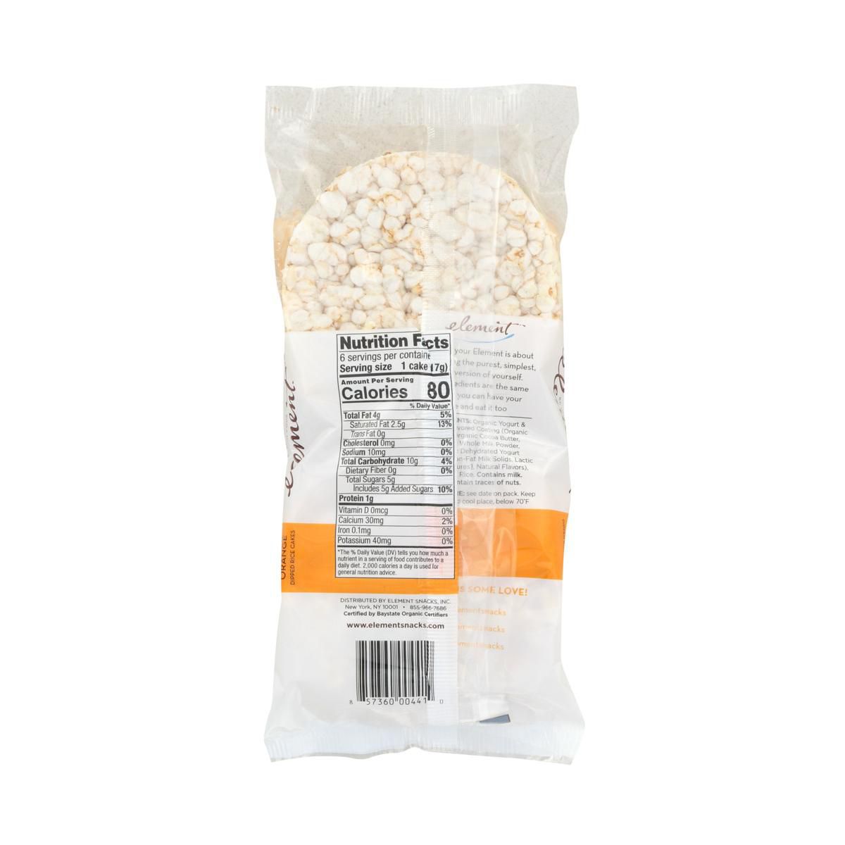 Galletas de arroz bañadas en sabor naranja-vainilla de Element. Orgánicas, certificadas sin gluten y kosher. Disfruta un snack delicioso y natural.