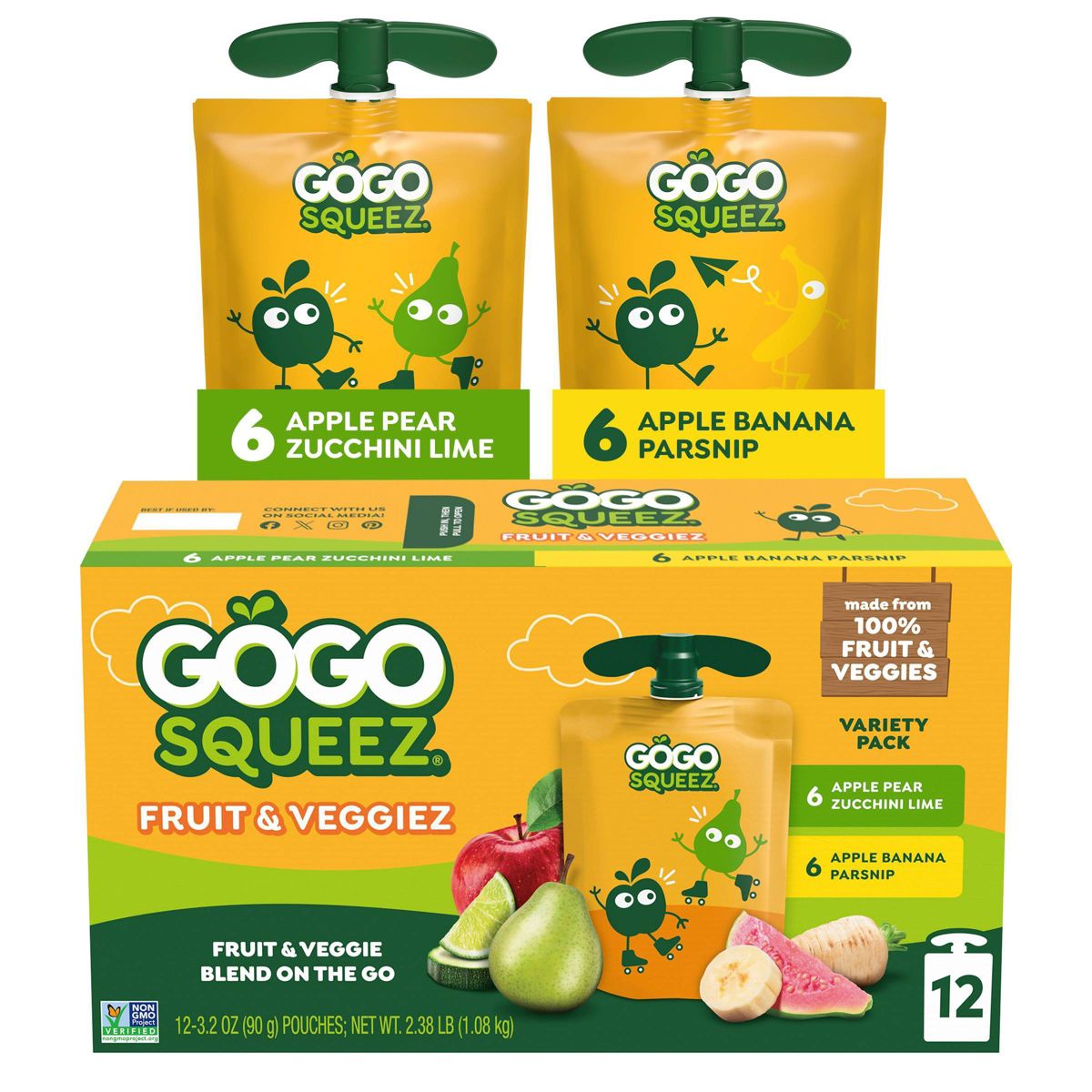 GoGo SqueeZ Fruit & VeggieZ Puré de Manzana y Frutas Variedad Manzana Plátano Chirivía & Pera Manzana Calabacita y Lima – 38.4 oz/12ct