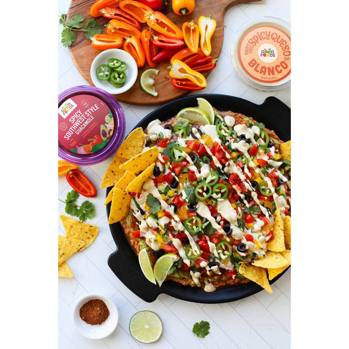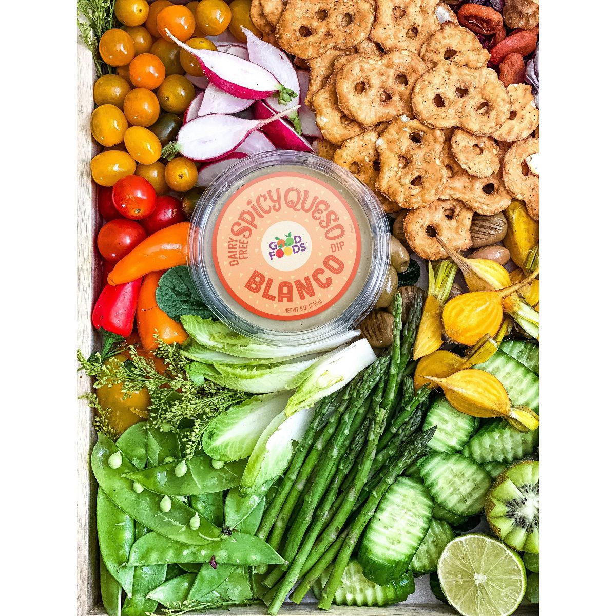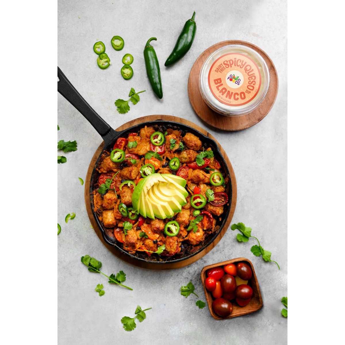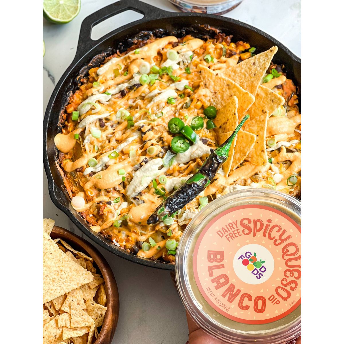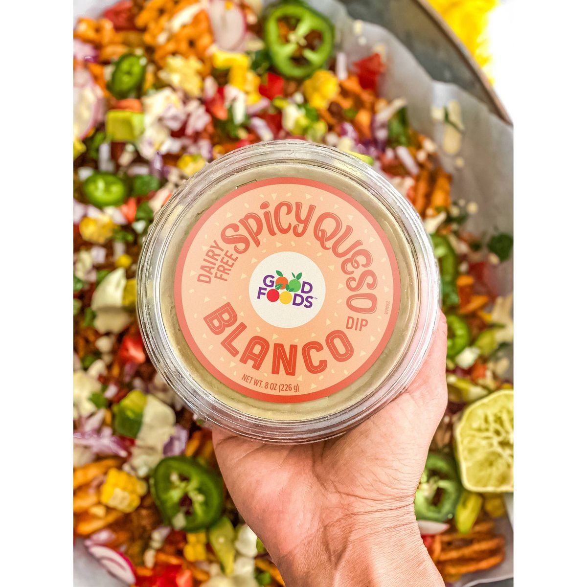 Disfruta el sabor picante y cremoso del dip vegano Good Foods. Perfecto para botanear, listo para comer y hecho con ingredientes de calidad. ¡Pruébalo!