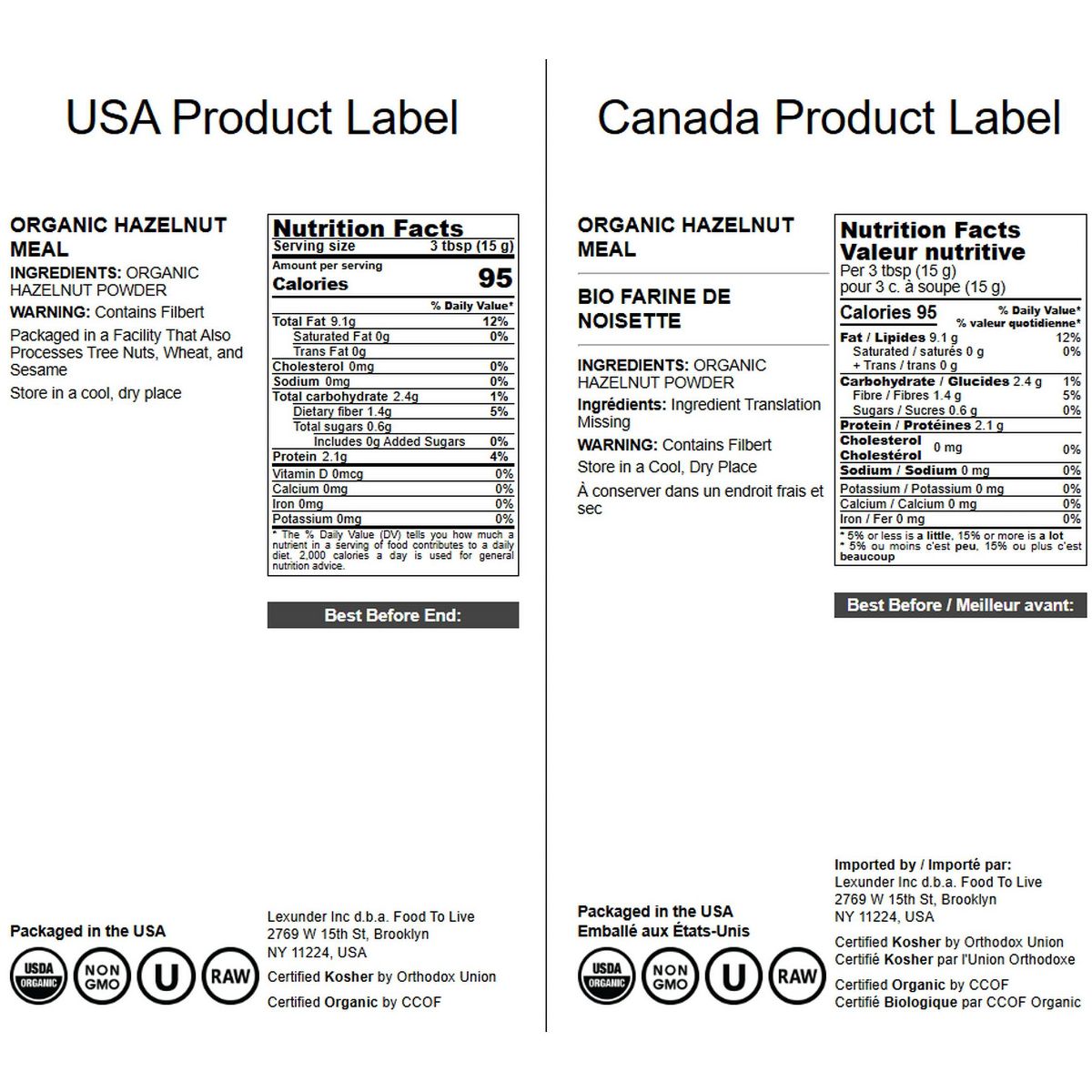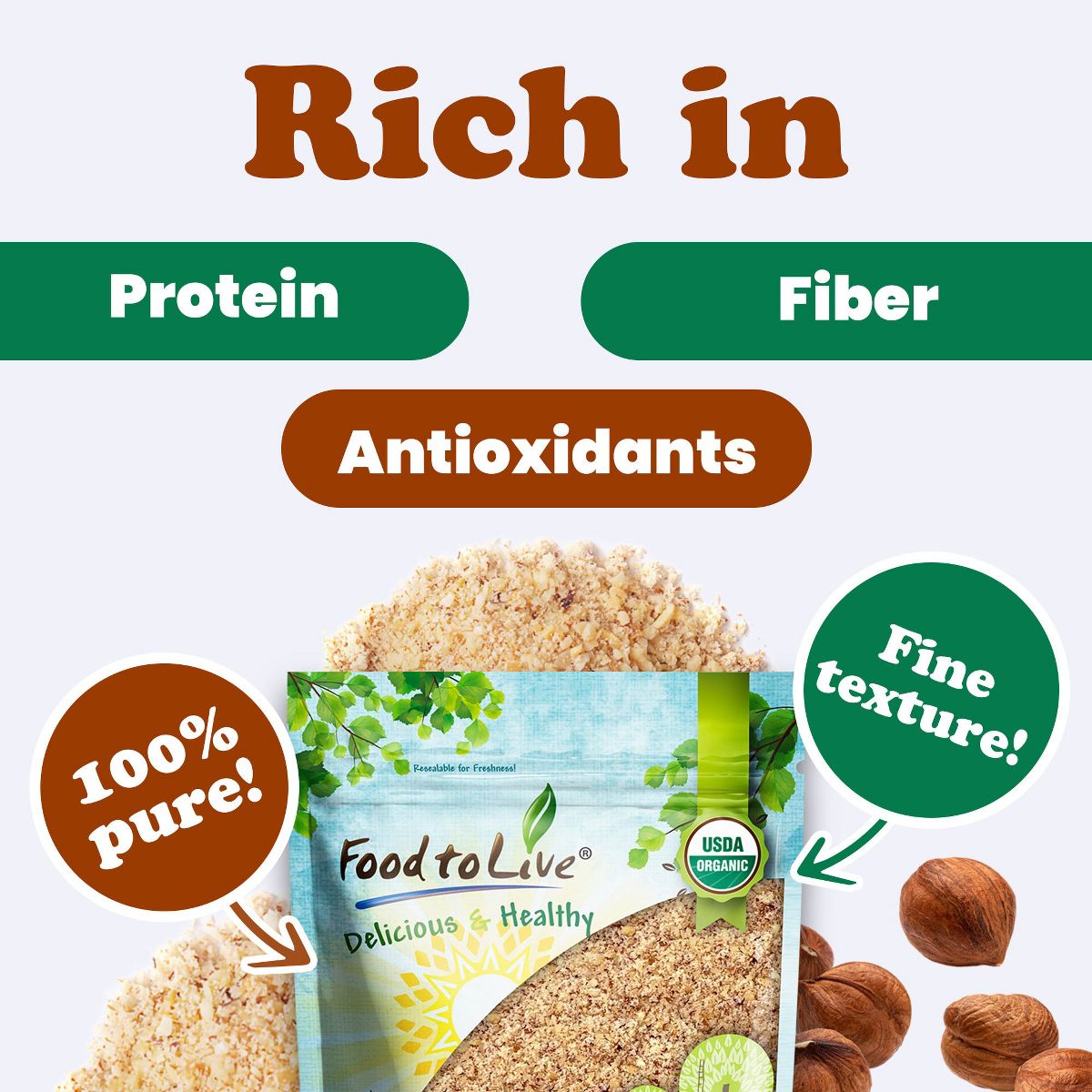 Harina de avellana orgánica Food to Live. Perfecta para repostería y batidos. ¡Consigue tu textura y sabor natural favorito!