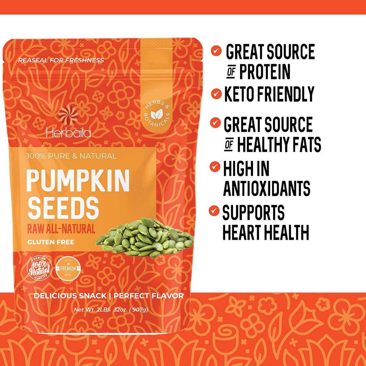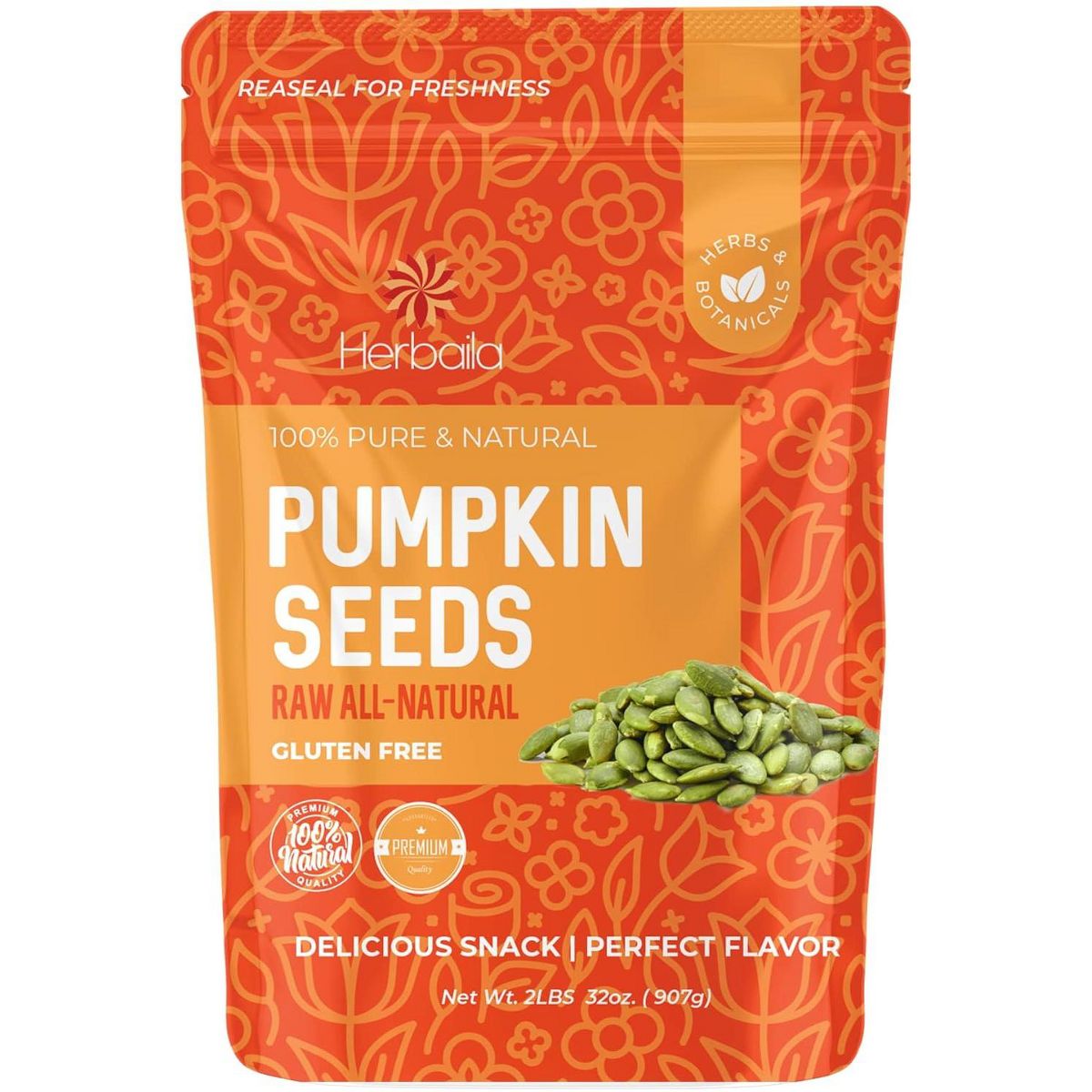 Herbaila Semillas de Calabaza Crudas, 2 lb (32 oz) – Sin Sal, Sin Cáscara, 100% Naturales, No Transgénicas, Sin Gluten, Pepitas para Botana, Hornear y Cocinar