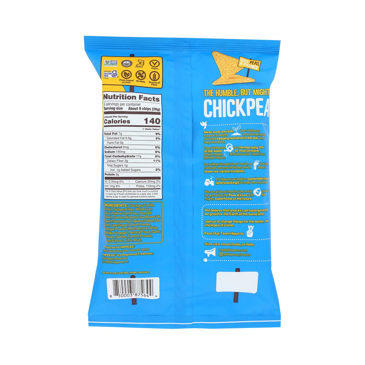 Prueba las Hippeas Rockin’ Ranch, papas de tortilla de garbanzo. Snack vegano, sin alérgenos principales y lleno de sabor. ¡Pide tu caja con 12 bolsas!