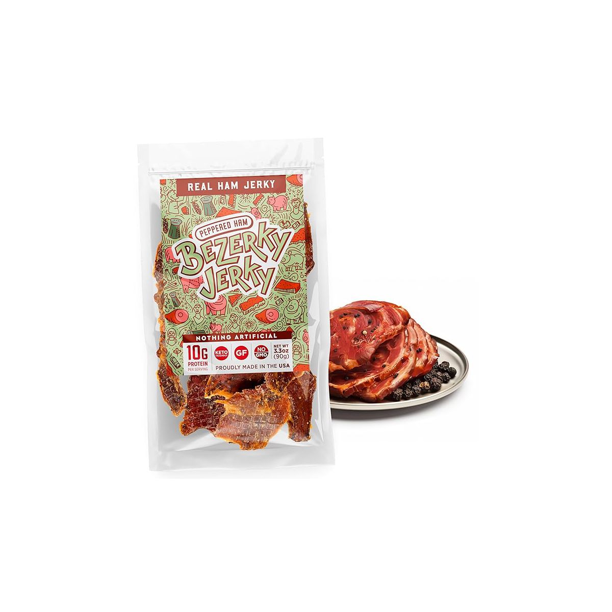 Jamón BZJ con Pimienta de BEZERKY JERKY. Disfruta el auténtico sabor del cerdo, realzado con pimienta. ¡Tu snack de carne premium!