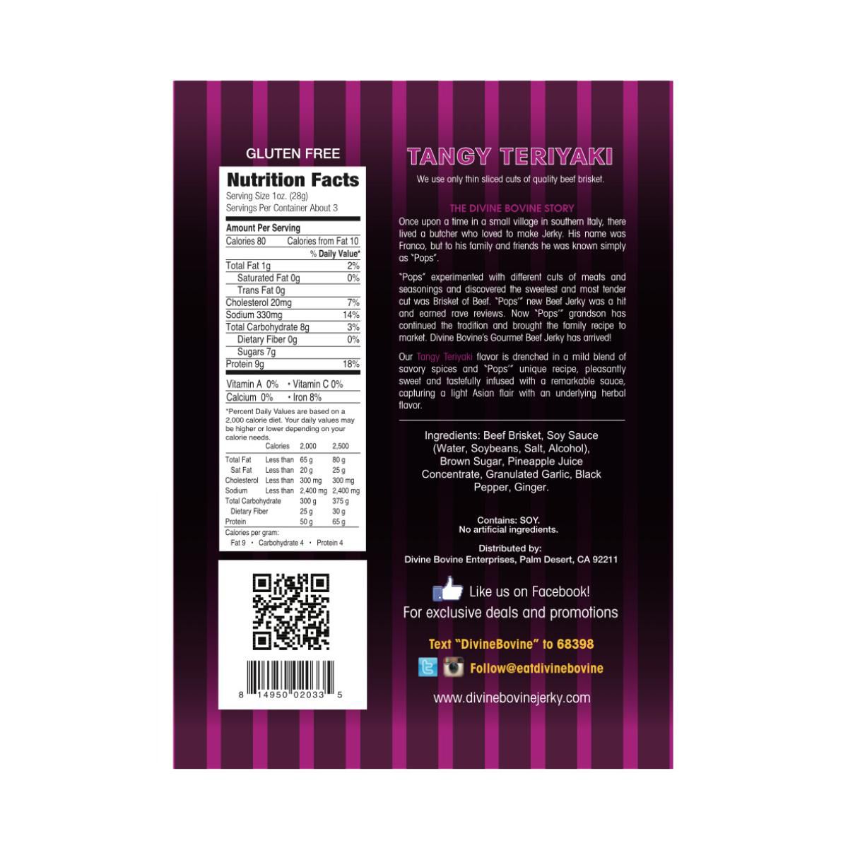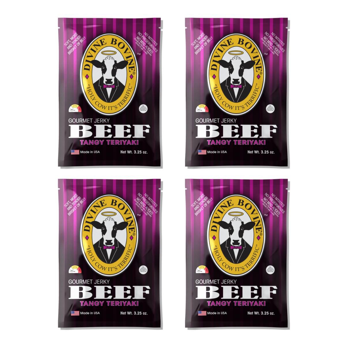 Jerky de Res Teriyaki Picante de Divine Bovine. Multipack ideal para compartir. Sin alérgenos mayores. ¡Sabor intenso y picante en cada bocado!