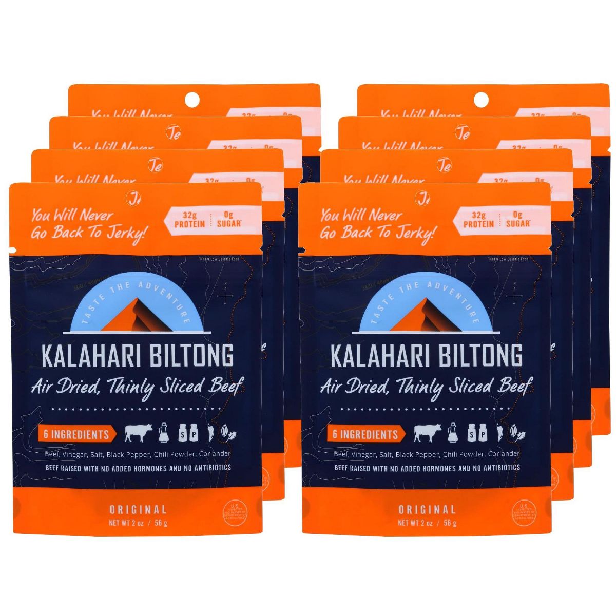 Kalahari Snacks Biltong Original: Carne de res secada al aire, 32g de proteína por porción. Sabor auténtico y nutritivo en una caja de 8 bolsas. ¡Pruébalo!
