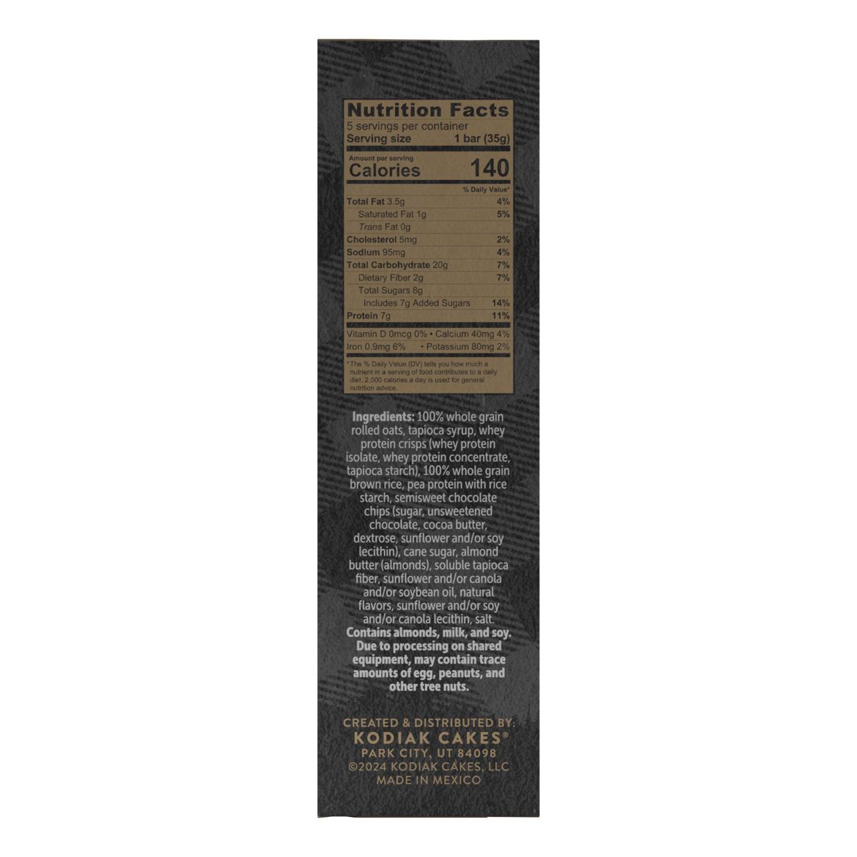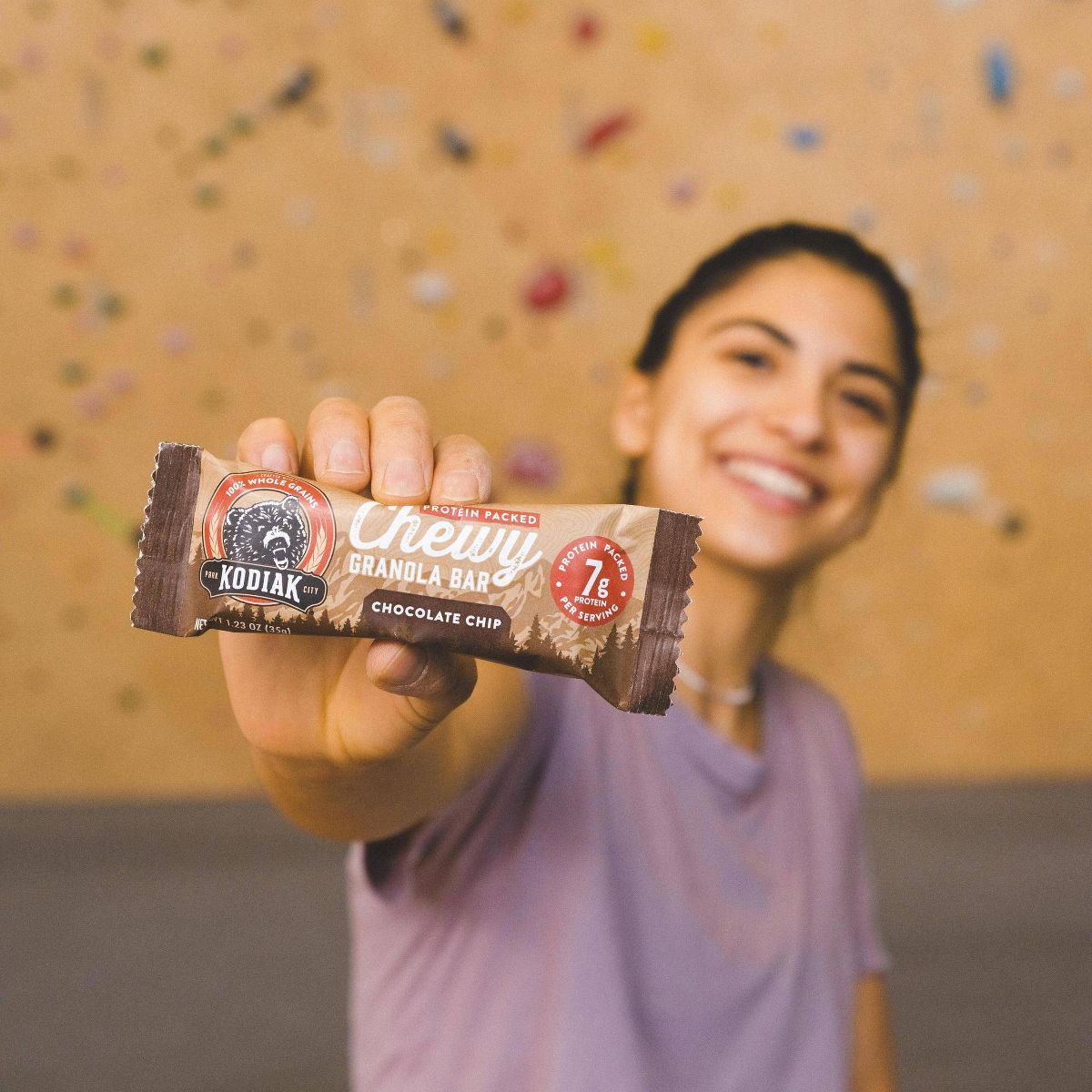 Deliciosas barras de granola Kodiak con chispas de chocolate. Textura suave y masticable, perfectas para un snack nutritivo y energético.