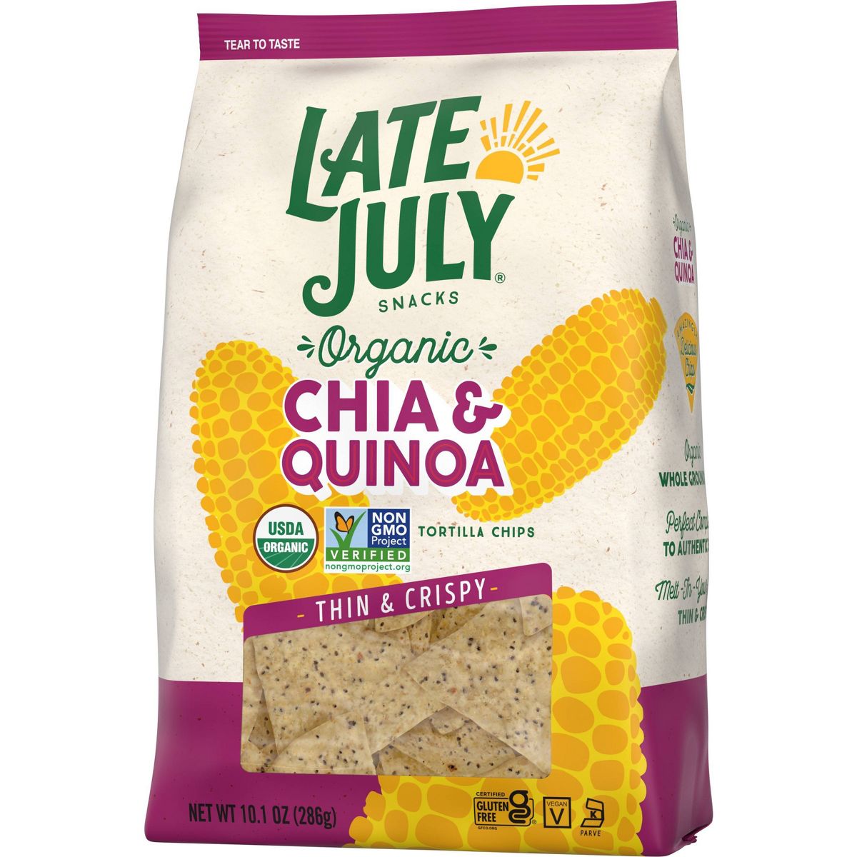 Delgadas tortillas de maíz orgánicas con chía y quinoa. Snacks Late July, crujientes, sin gluten y certificados no transgénicos. ¡Ideales para ti!