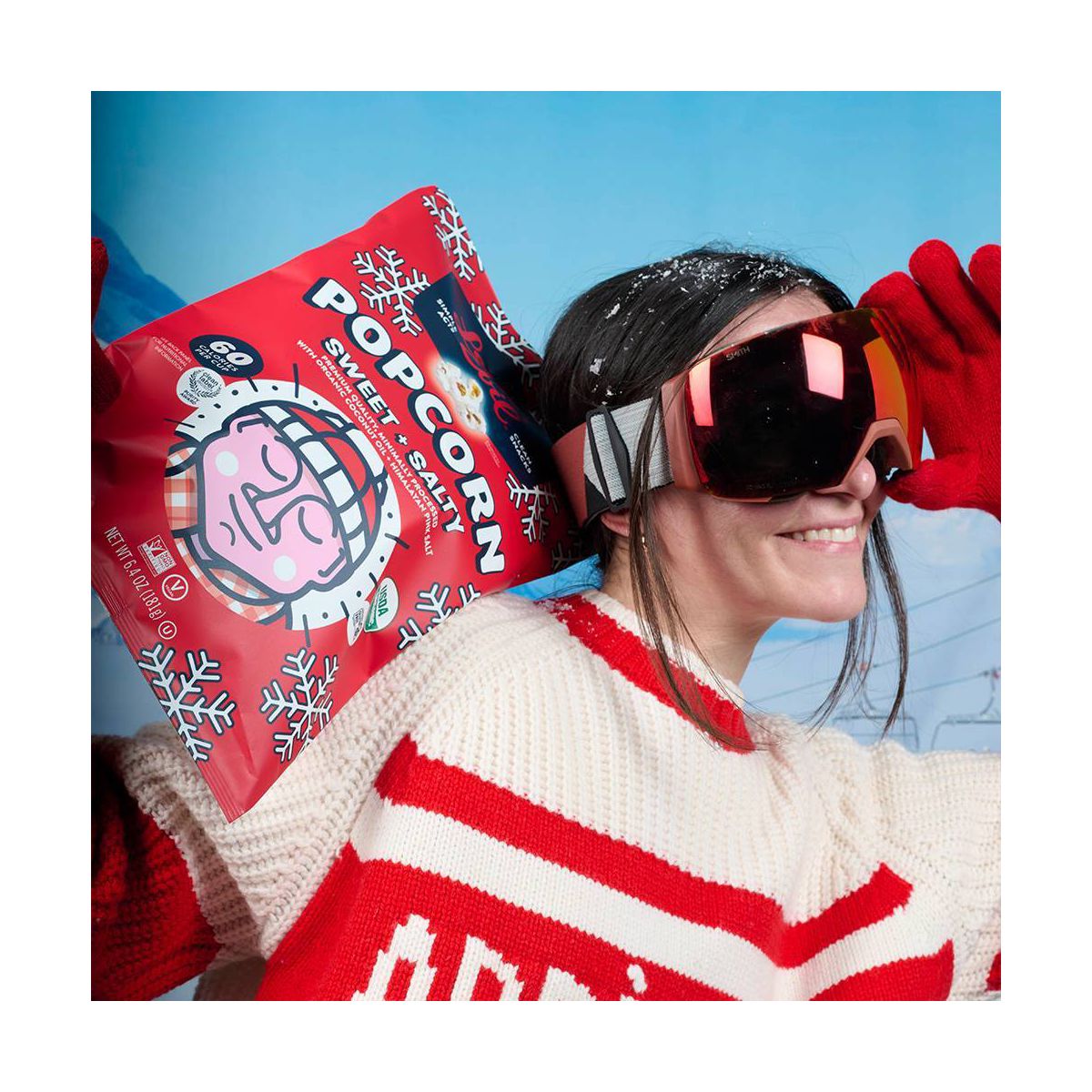 Disfruta las palomitas orgánicas navideñas LesserEvil, con el equilibrio perfecto entre dulce y salado. Un snack delicioso para compartir en temporada.
