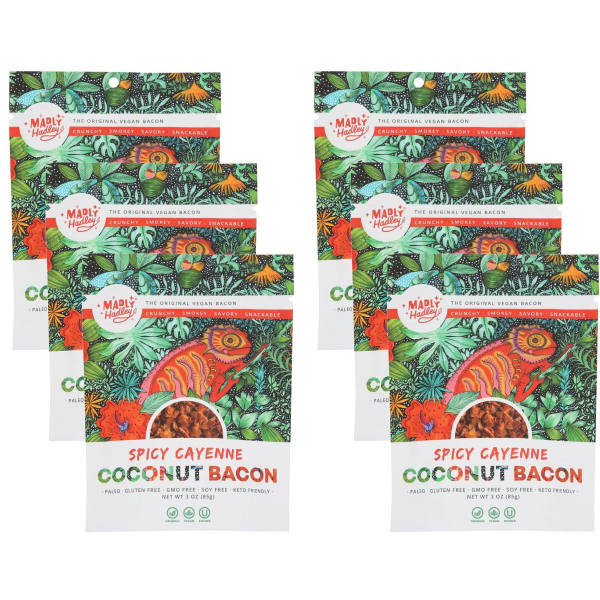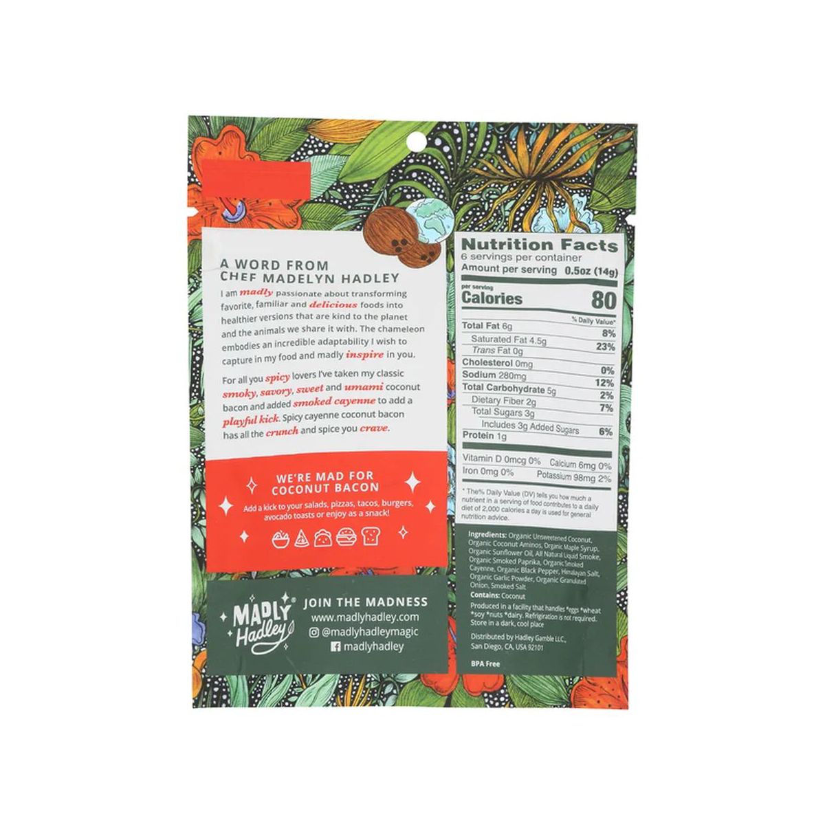 Tocino de coco picante cayenne Madly Hadley. Deliciosos trozos crujientes y veganos. ¡Pruébalos en tu caja de 6 unidades!
