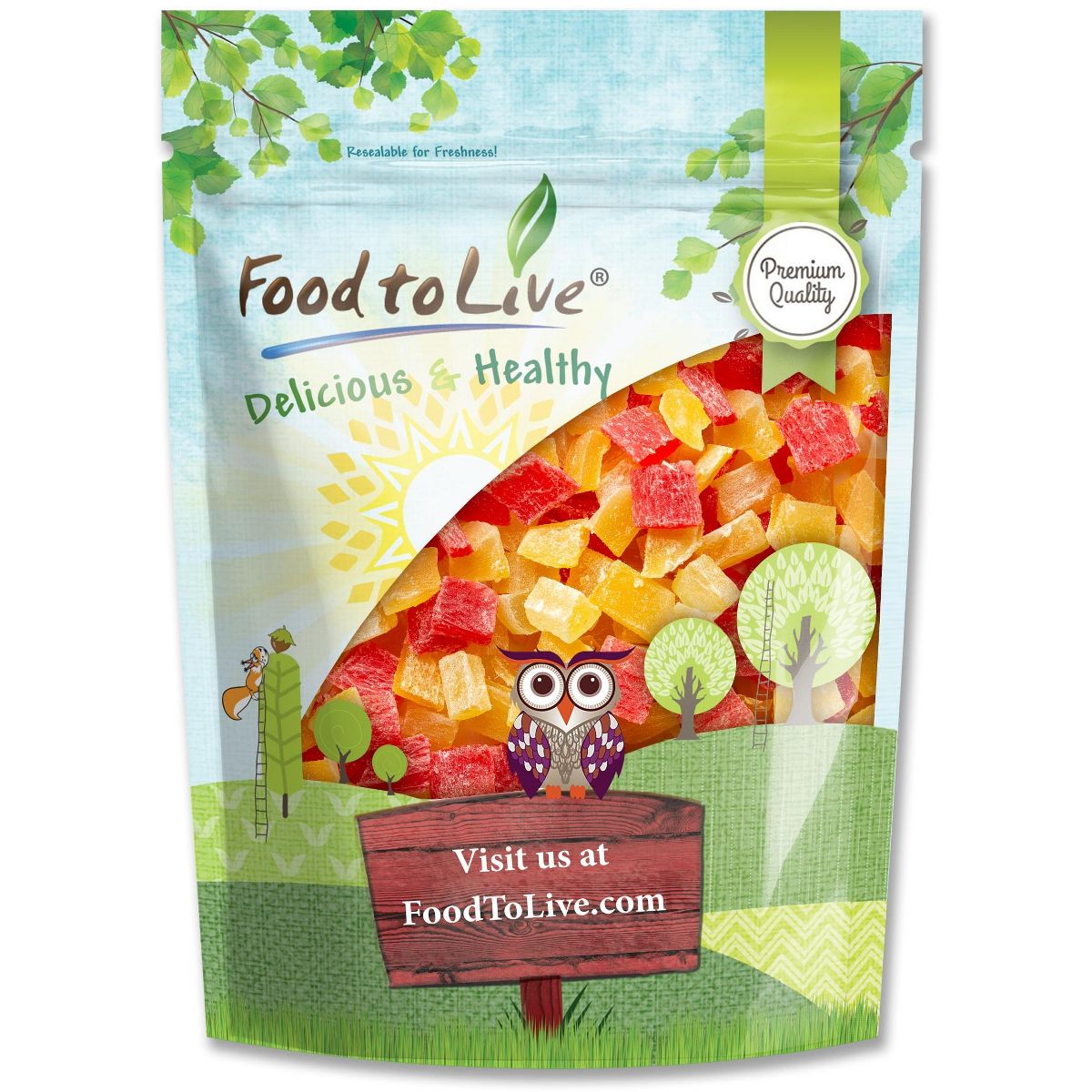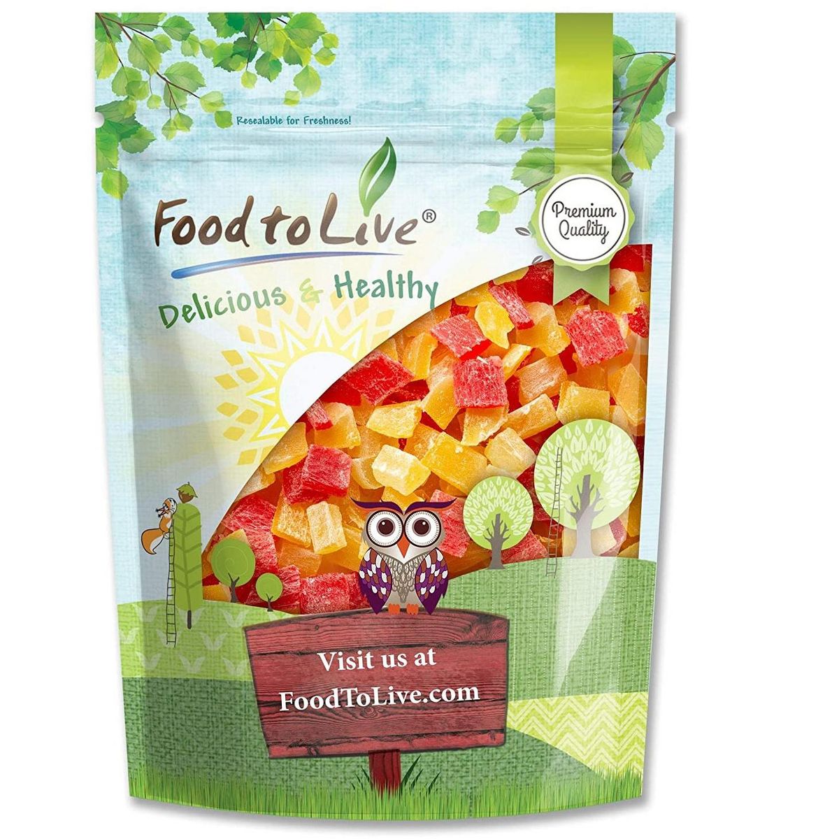 Disfruta la frescura y sabor natural de nuestra Mezcla de Frutas en Cubos Food to Live. Ideal para snacks saludables, libre de los 9 alérgenos principales.