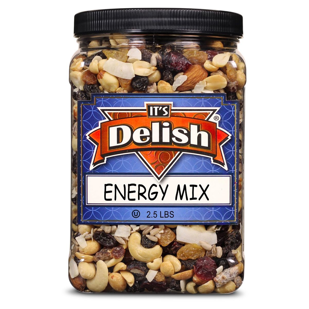 Mezcla energética It’s Delish con frutas y nueces. Contenedor jumbo de 2.5 lbs, ideal para tu día. ¡Sabor y energía en cada bocado!