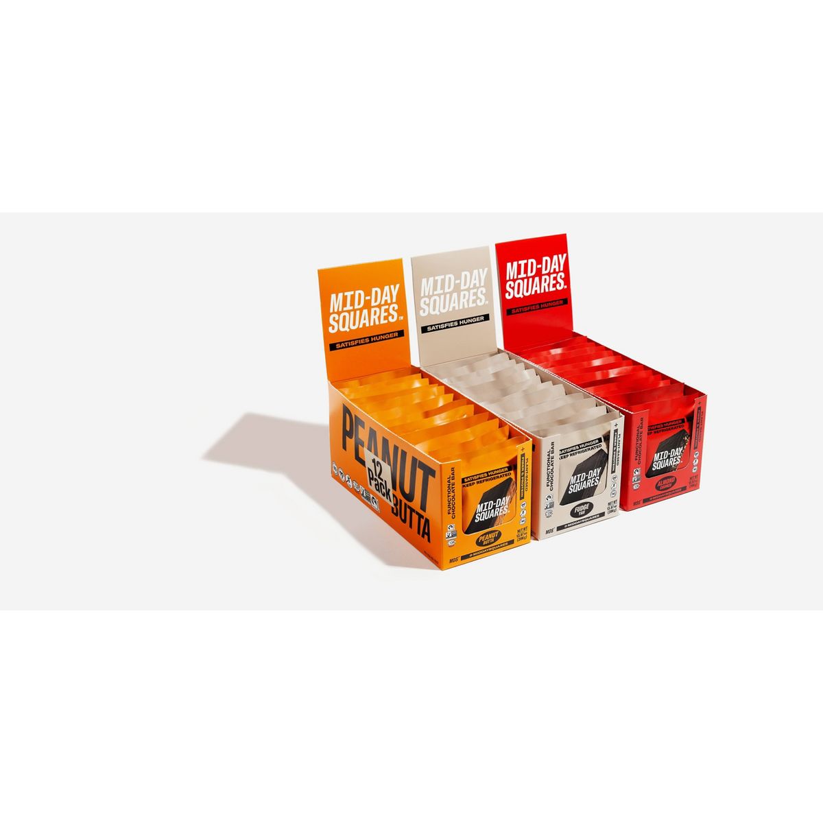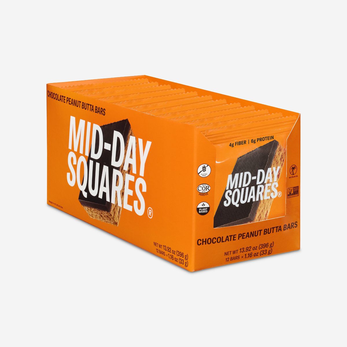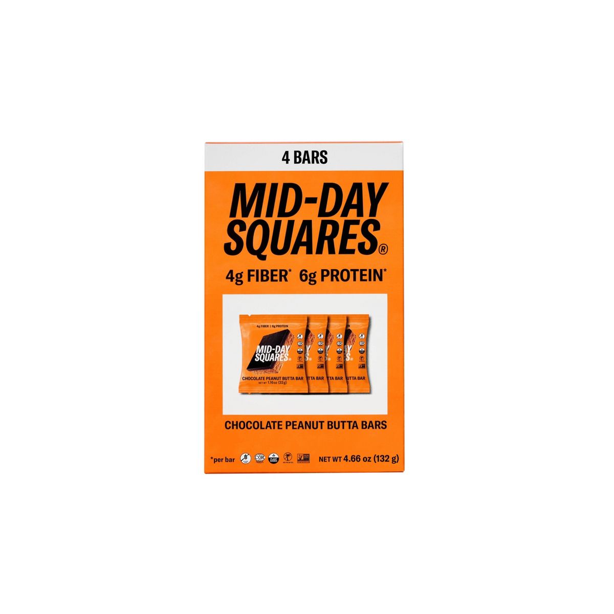 Disfruta la cremosa barra de chocolate funcional Mid-Day Squares con sabor a mantequilla de maní. ¡Delicia orgánica y vegana para tu día!