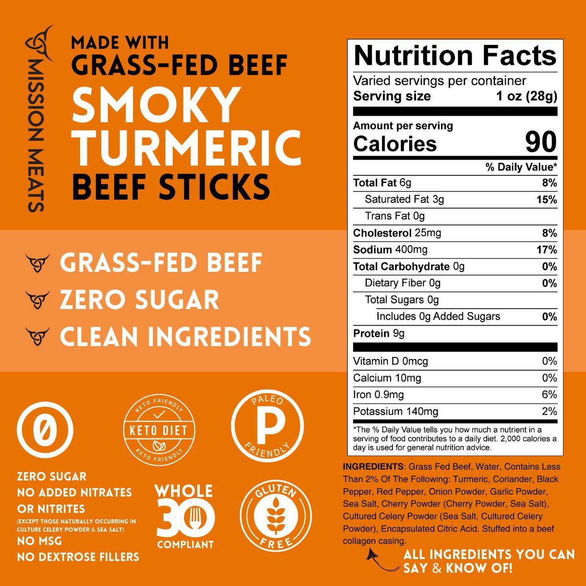Mission Meats Beef Sticks, 100% Alimentado con Pastura y Criado al Aire Libre, Sin Azúcar, Sin Gluten, Snacks Saludables, Whole 30, Paleo, Cúrcuma Ahumada 1 oz