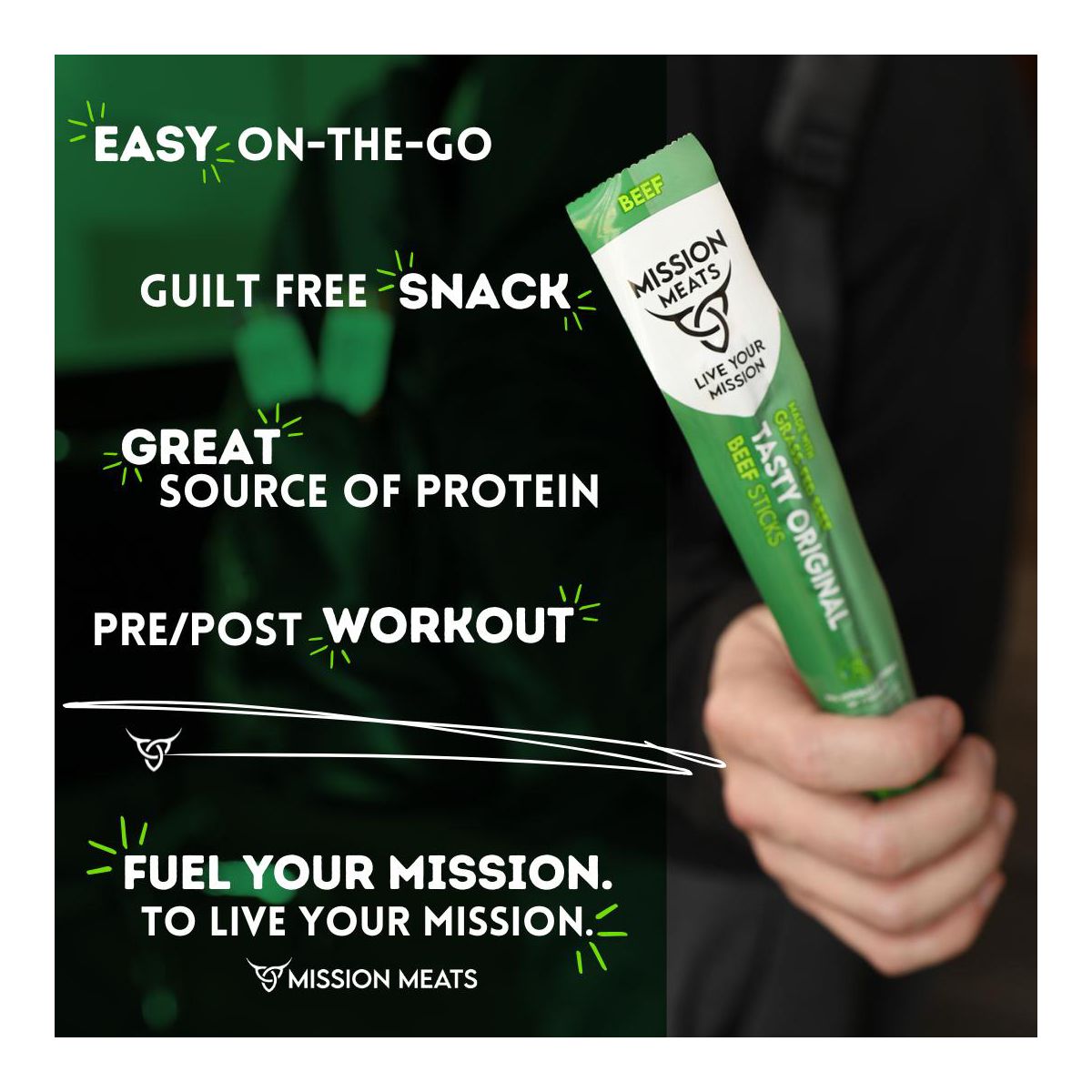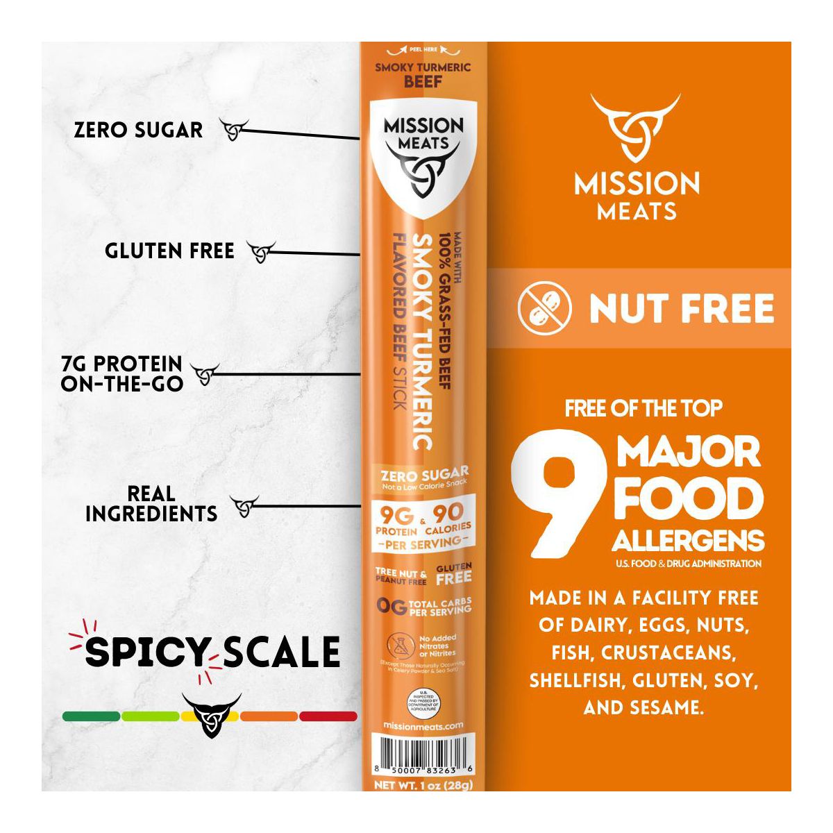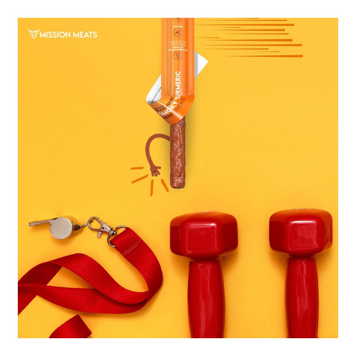 Snack saludable Mission Meats: palitos de res 100% alimentados con pastura, sin azúcar ni gluten. 9g de proteína por porción. ¡Sabor ahumado con cúrcuma!
