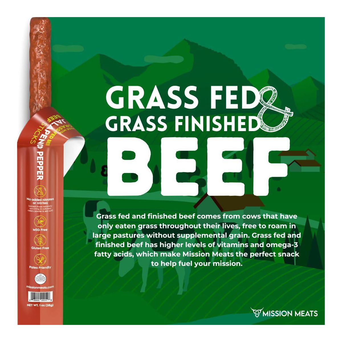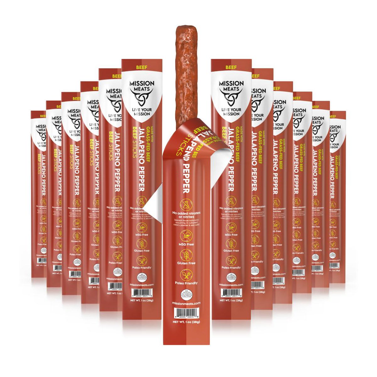 Mission Meats Beef Sticks – 100% Alimentado con Pastura y Criado Libremente, Sin Azúcar, Botanas Saludables Envueltas Individualmente, Whole 30 y Paleo, Jalapeño 1oz (12ct)