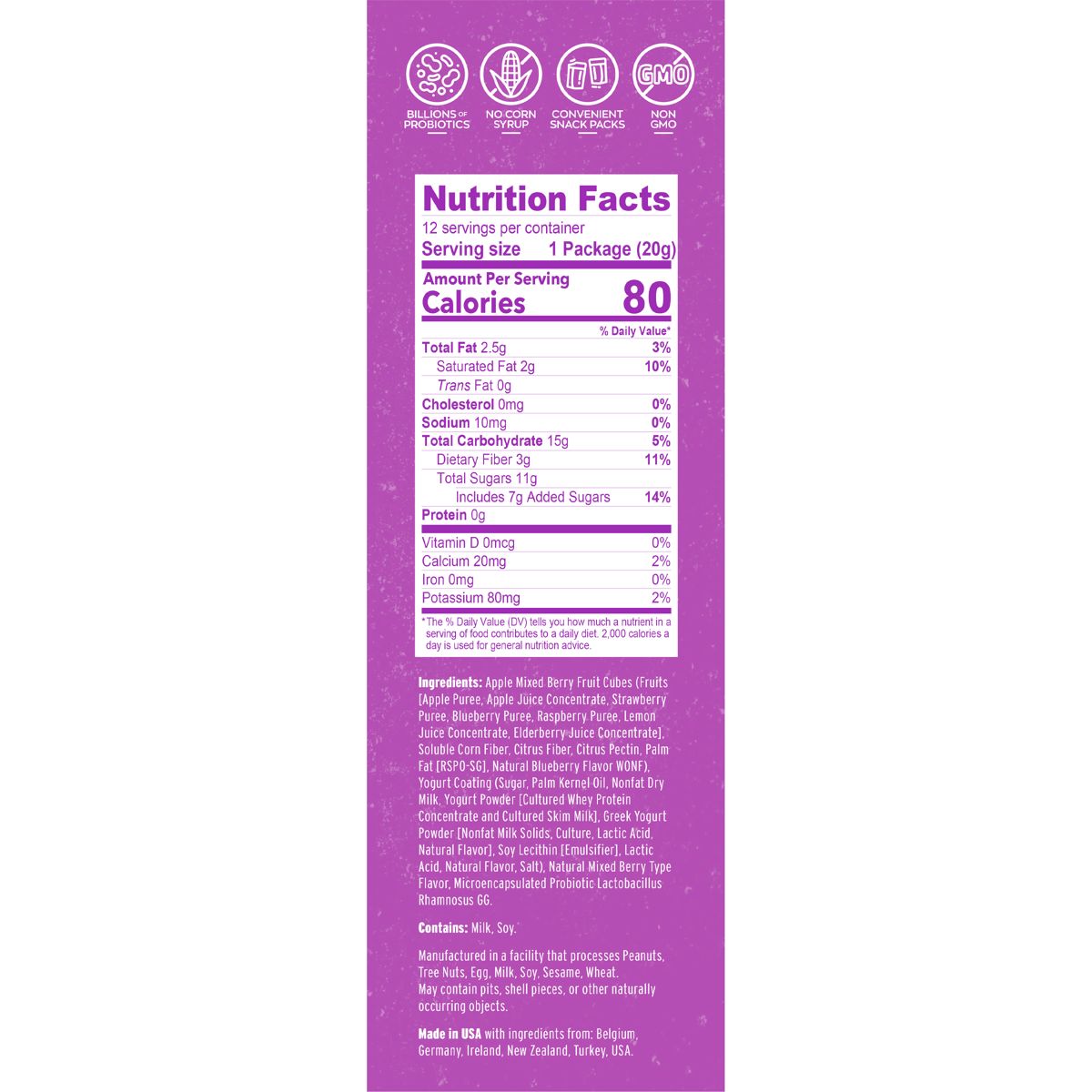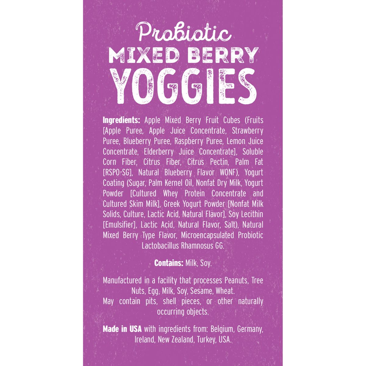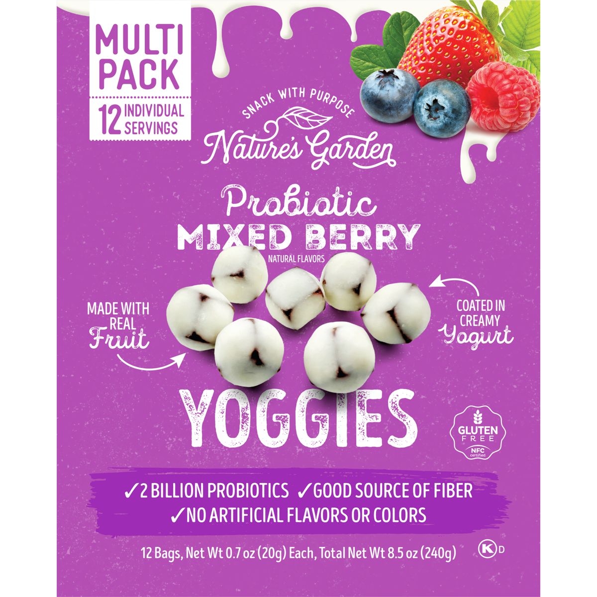 Bocadillos de fruta Nature’s Garden Snacks Yoggies con probióticos. Mezcla de bayas, sin gluten, certificado Non-GMO y Kosher. ¡Deliciosa y saludable!
