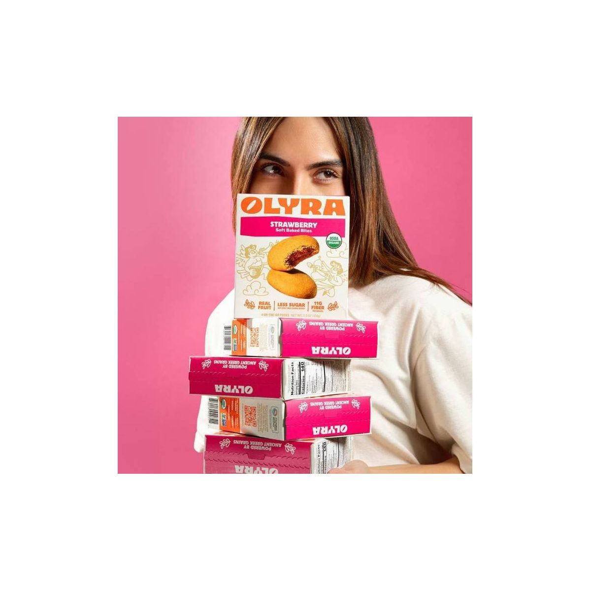 Deliciosos bocadillos horneados de fresa Olyra. Su textura suave y masticable es el snack perfecto para cualquier momento del día. ¡Pruébalos!