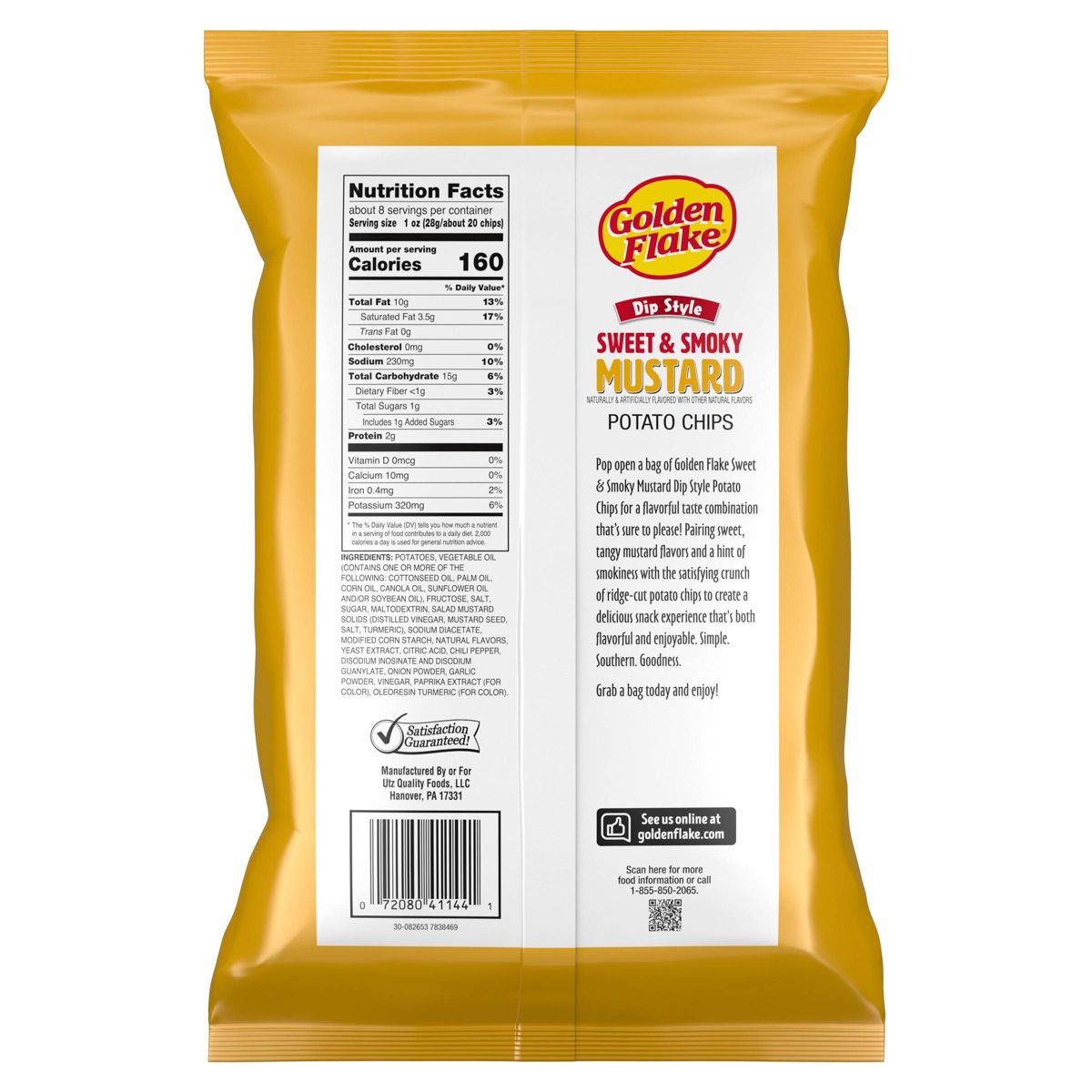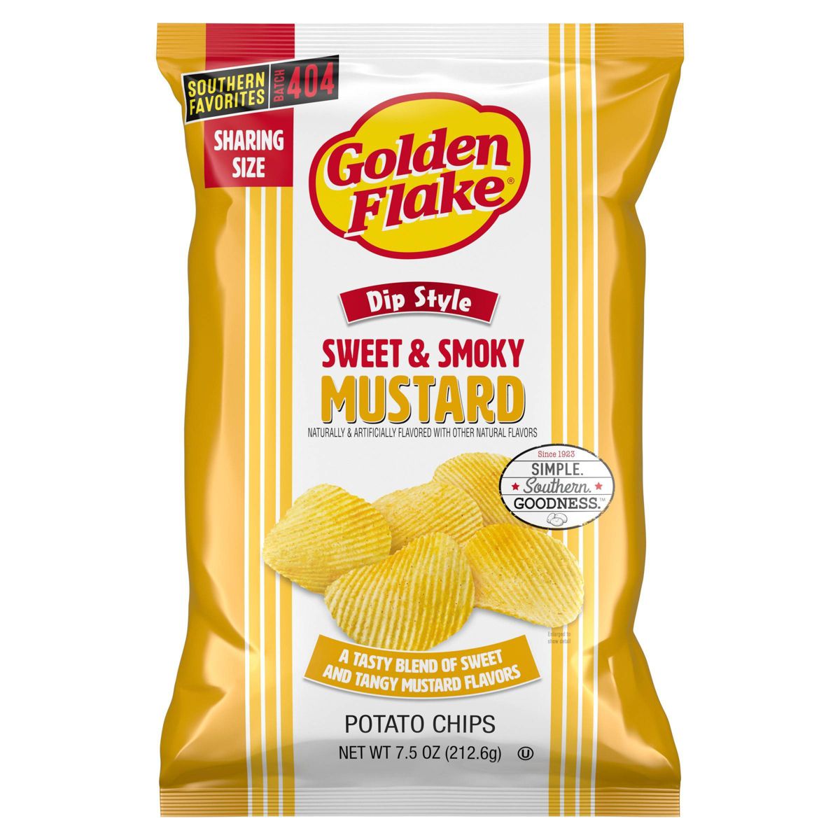 Papas fritas Golden Flake con el sabor único de mostaza dulce y ácida. Disfruta de su textura crujiente en cada chip. ¡Pruébalas!