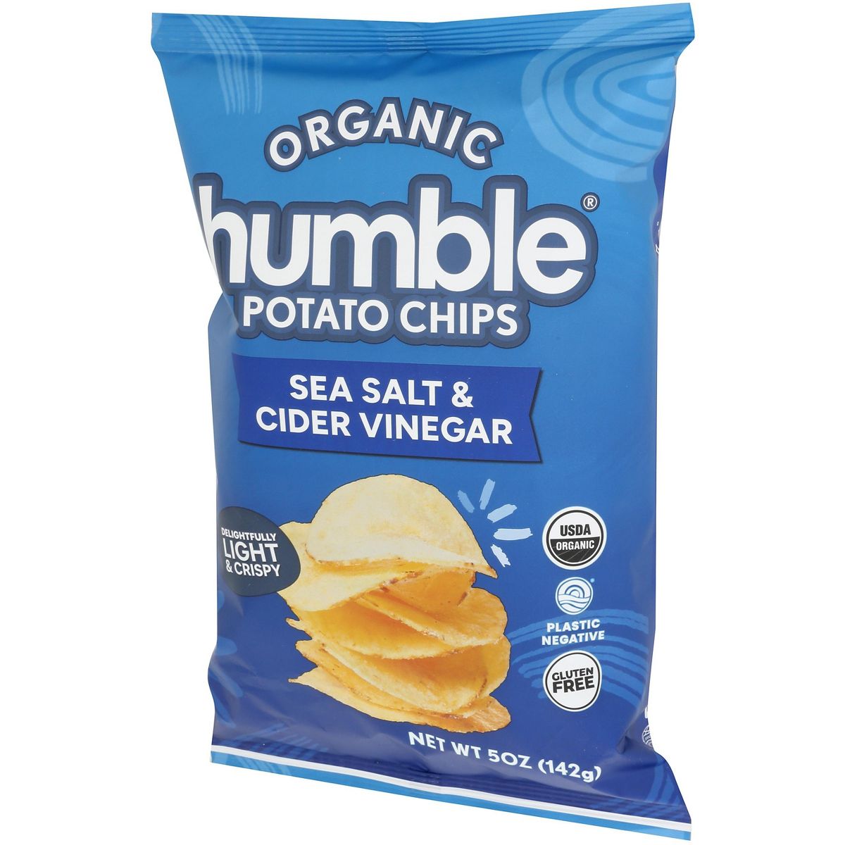 Papas fritas Humble con sal de mar y vinagre de sidra. Sabor intenso y crujiente en cada bocado. Sin alérgenos mayores. Caja con 12 bolsas de 5 oz.