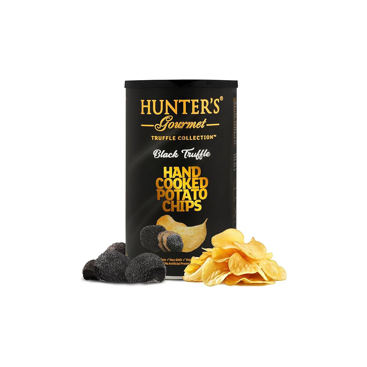 Papas fritas Hunter’s Gourmet con trufa negra. Snack vegano gourmet, crujiente y lleno de sabor. Disfruta de un capricho único.