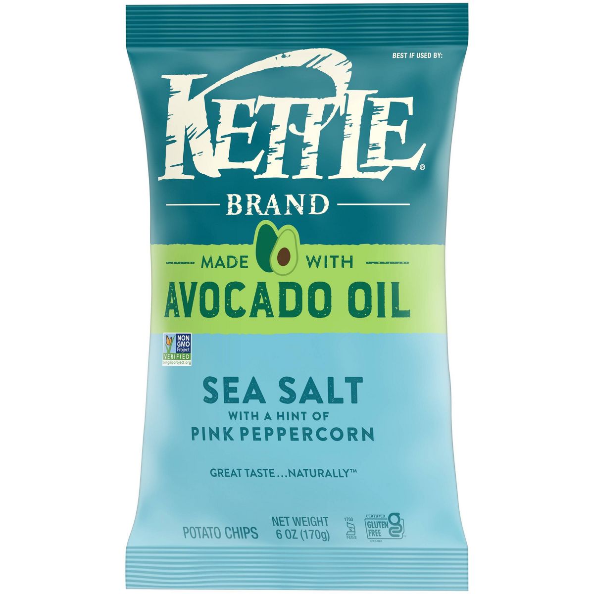 Papas Fritas Kettle Brand con el sabor único del aguacate y sal de mar. Sin gluten, verificadas Non-GMO. Disfruta su textura artesanal.
