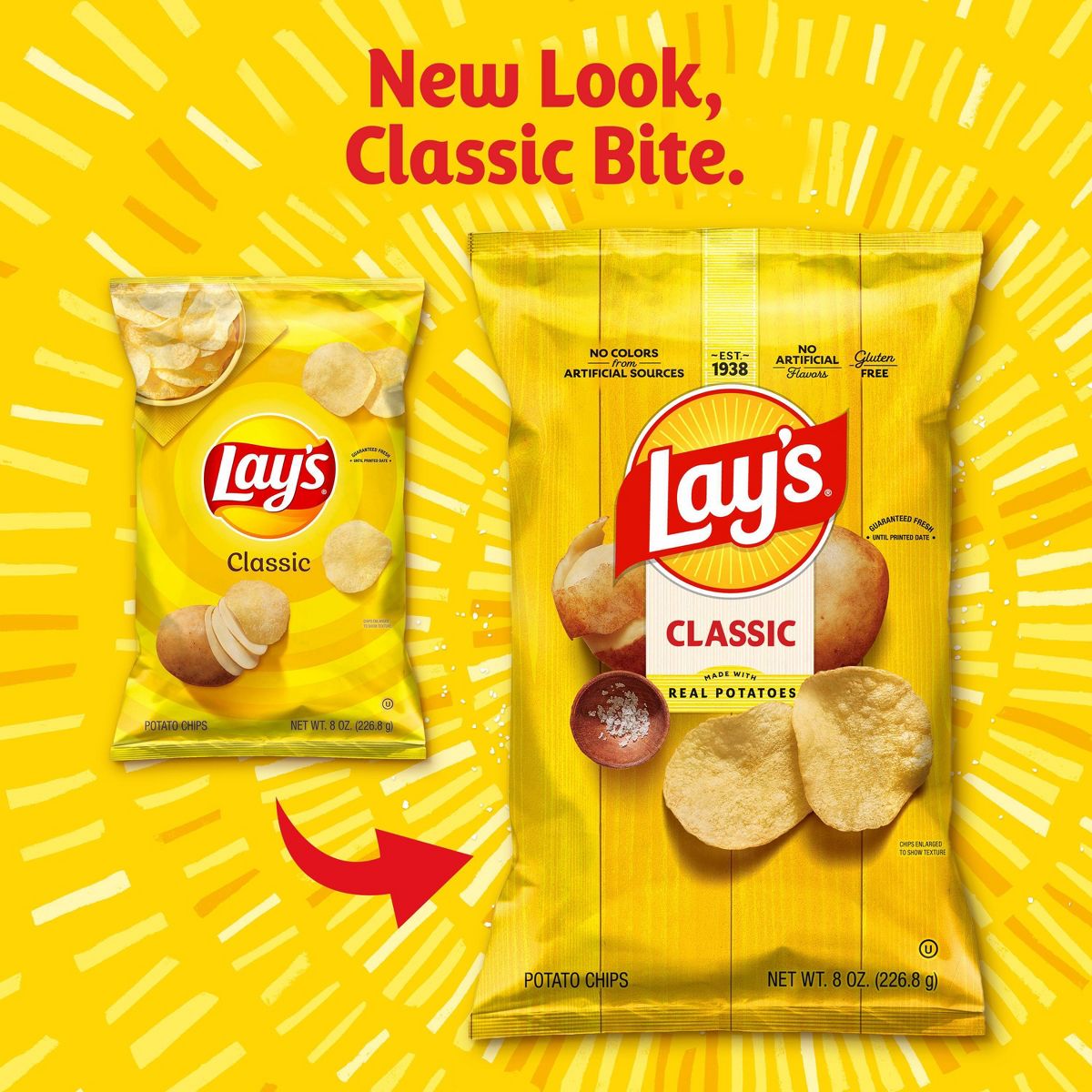 Papas Fritas Lay’s Clásicas, el sabor original e irresistible. Disfruta de su crujiente textura, sin gluten y certificadas Kosher, en el práctico paquete de 8…