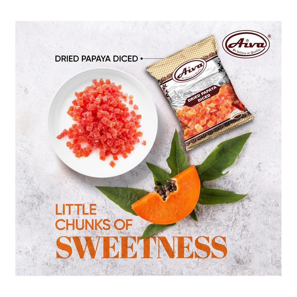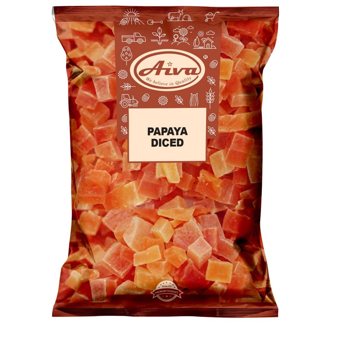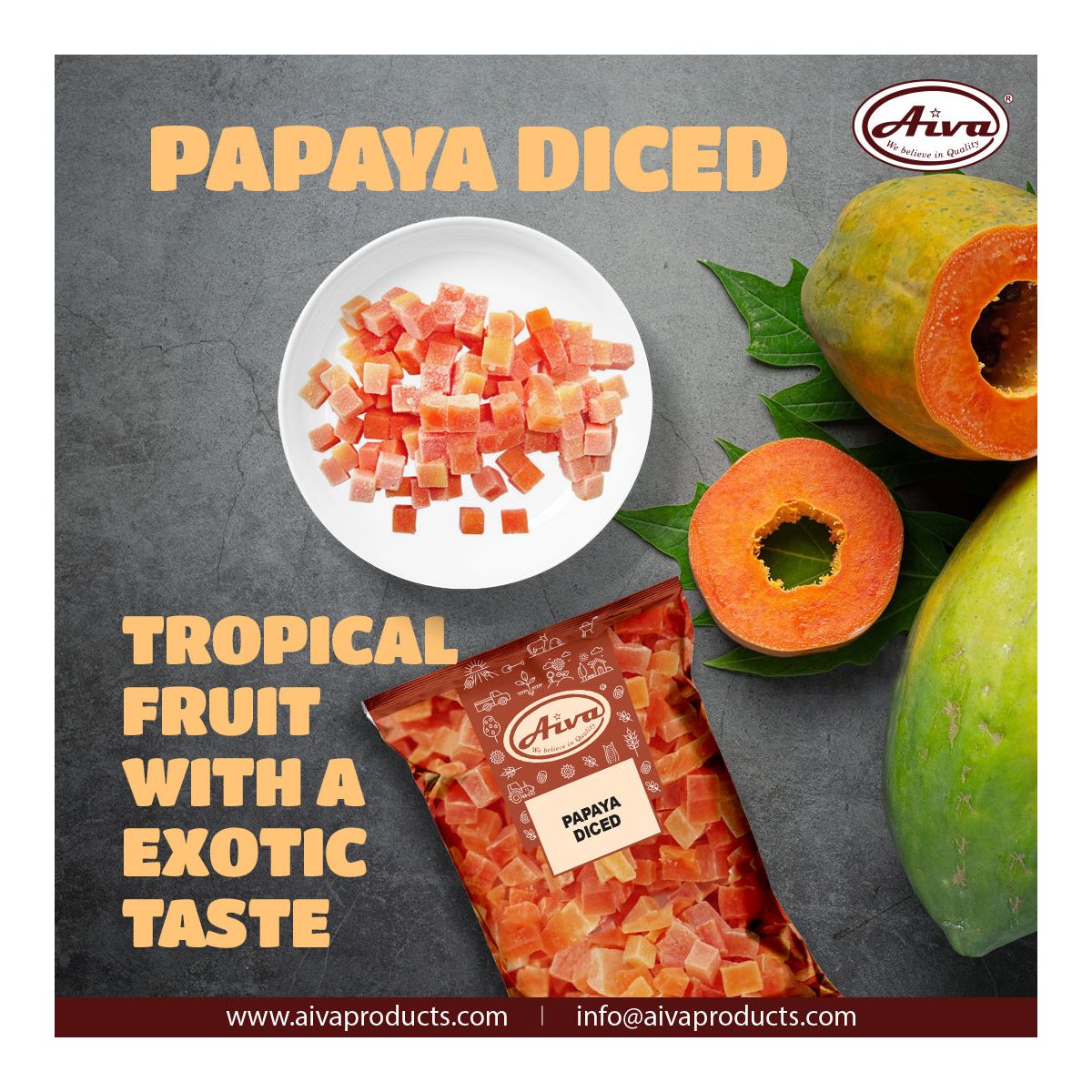 Papaya en cubos Aiva Products. Lista para disfrutar, ideal para batidos, postres o como snack saludable. ¡Sabor tropical en cada bocado!
