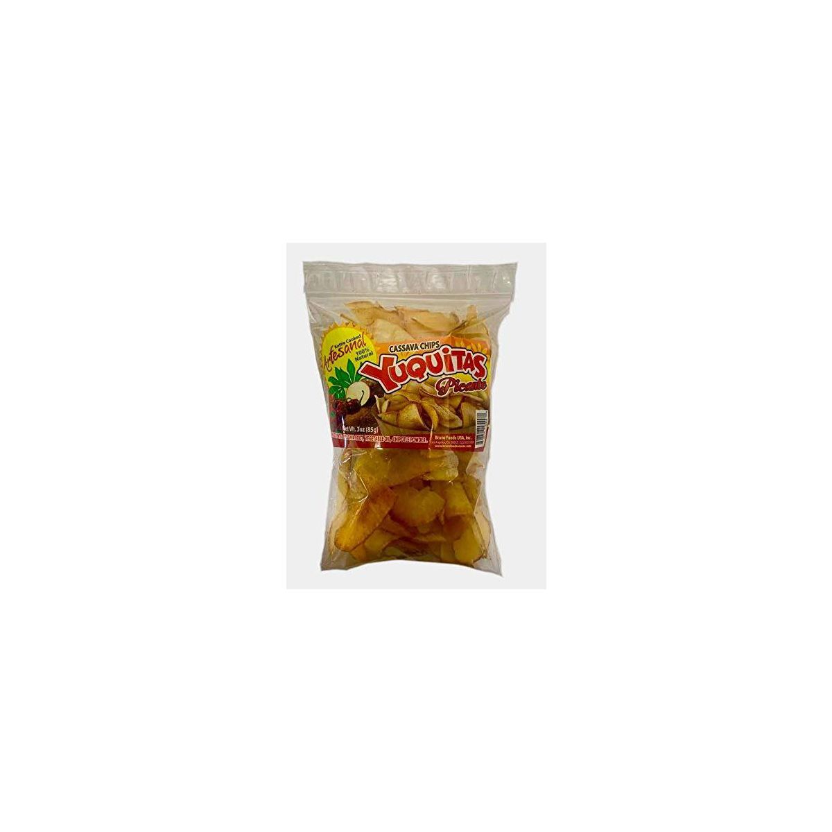 Disfruta el sabor picante y crujiente de la yuca con este paquete de 3 chips Yuquitas de Bravo Foods. ¡El snack perfecto para compartir!