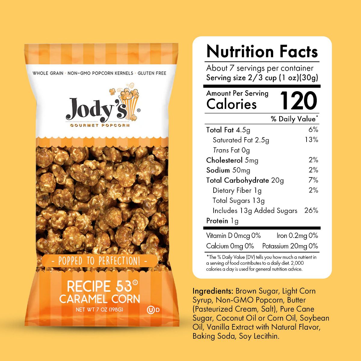 Disfruta 8 sabores únicos de palomitas Jodys Popcorn, como Pastel de Cumpleaños y Queso Cheddar Doble. ¡El snack perfecto para compartir!