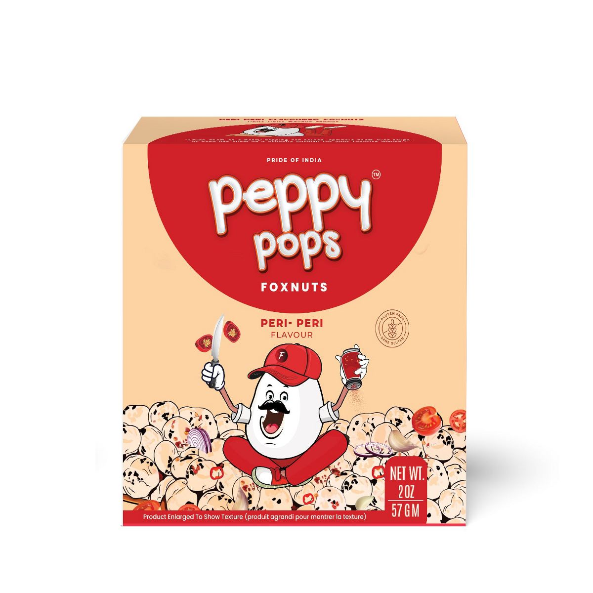 Disfruta los PEPPY POPS de Pride Of India: tostadas de foxnuts infladas con el picante y sabroso sabor Peri Peri. ¡Una botana irresistible!