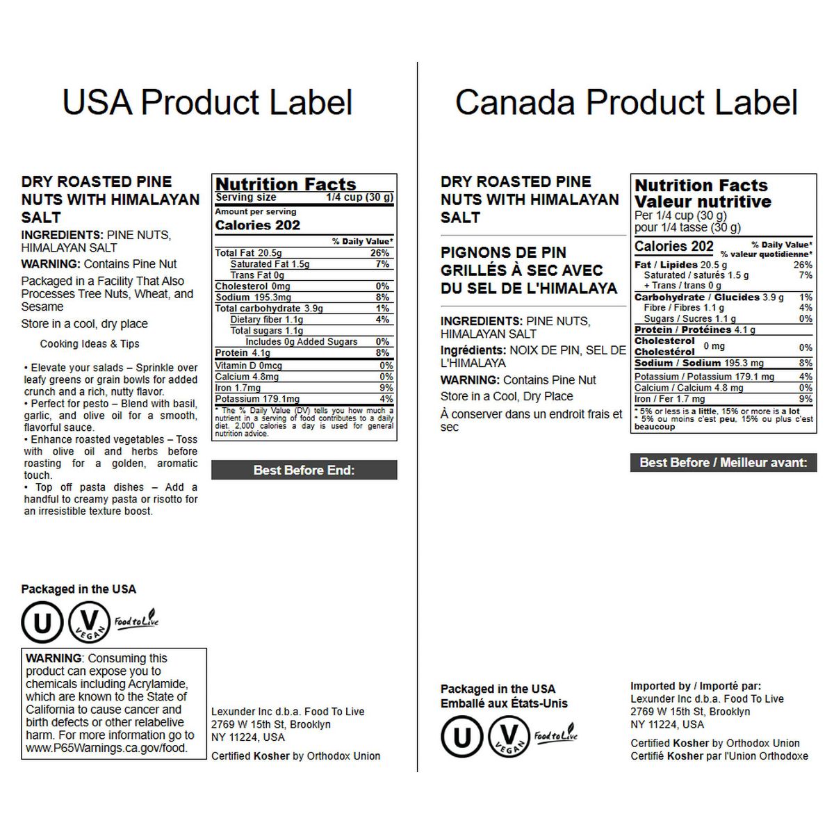 Piñones tostados con sal del Himalaya de Food to Live. Enteros, secos y listos para disfrutar como snack saludable o en tus recetas.