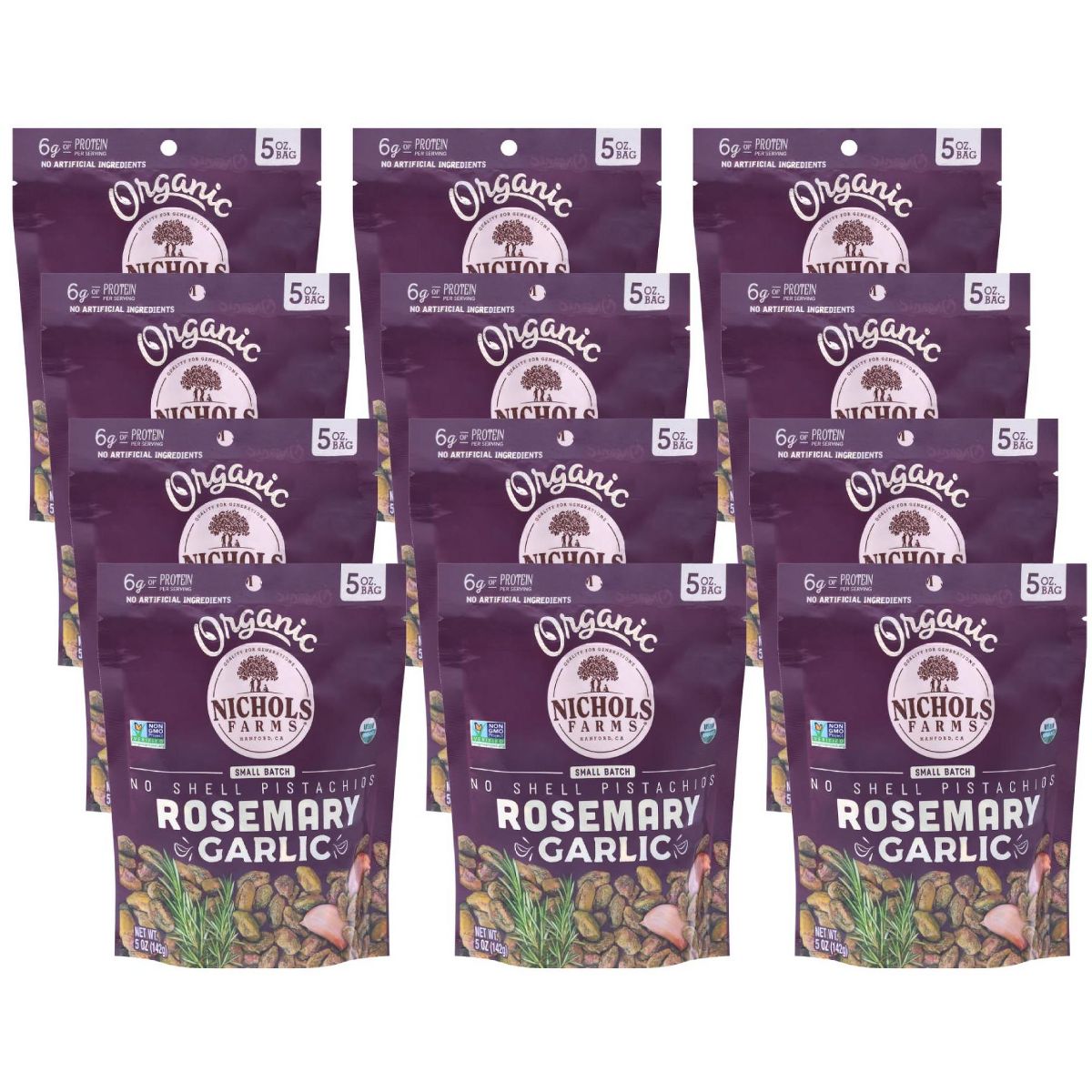 Pistachios Nichols Farms con sabor a romero y ajo. Snack saludable y delicioso, perfecto para compartir. Compra tu caja de 12 bolsas ahora.